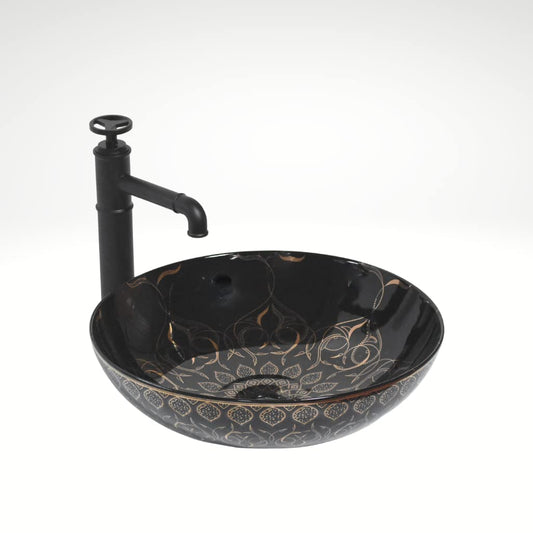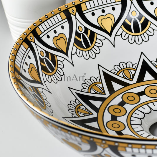 InArt Moroccan Ceramic Black Gold Wash Basin - Countertop Tabletop Basin for Bathroom/Home/Office/Hotels (16.5 x 16.5 x 5.5 Inches) DW342