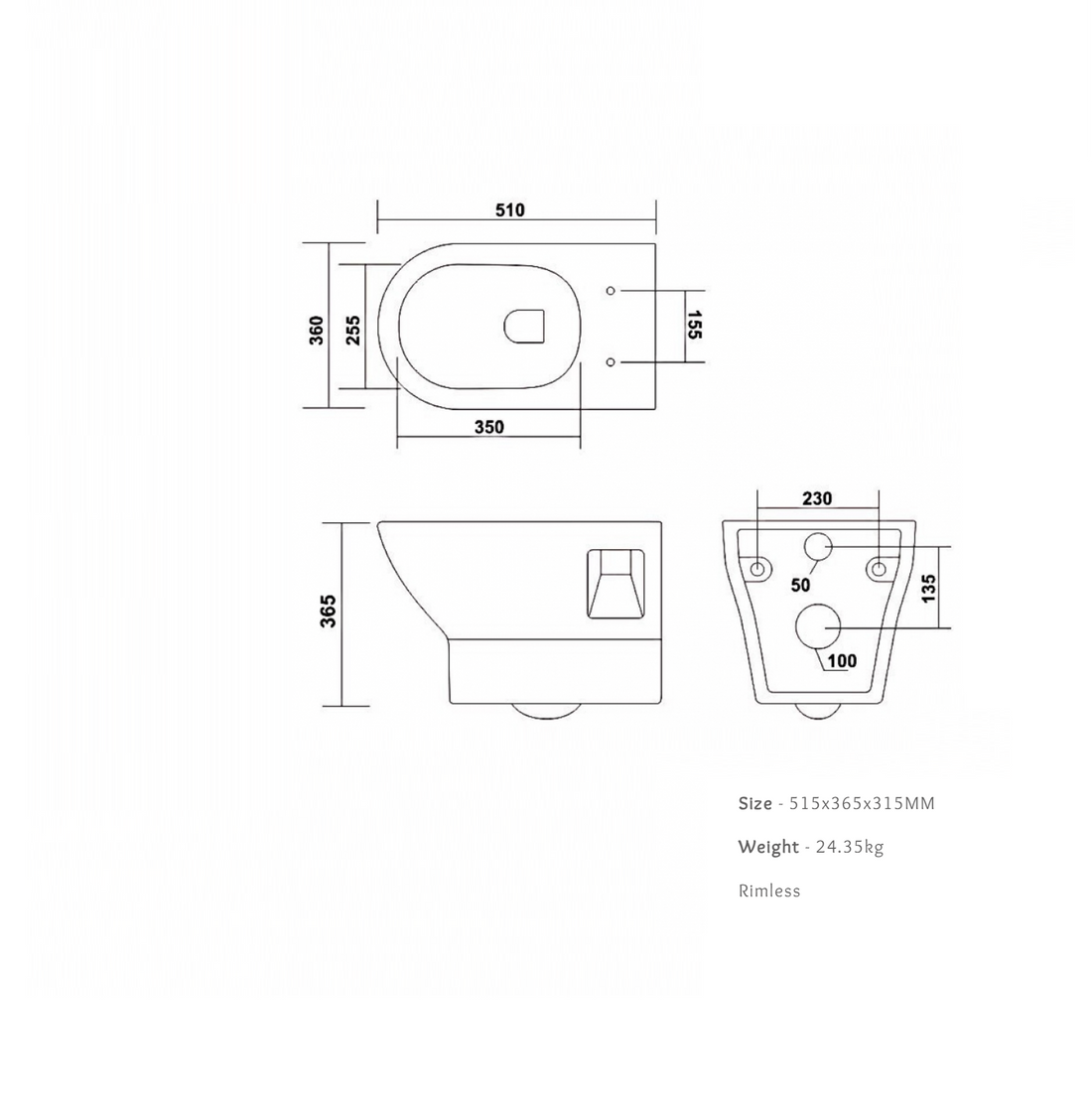 InArt Rimless Ceramic Wall-Hung Toilet - White, Soft Close Seat Cover, P Trap Outlet WH017
