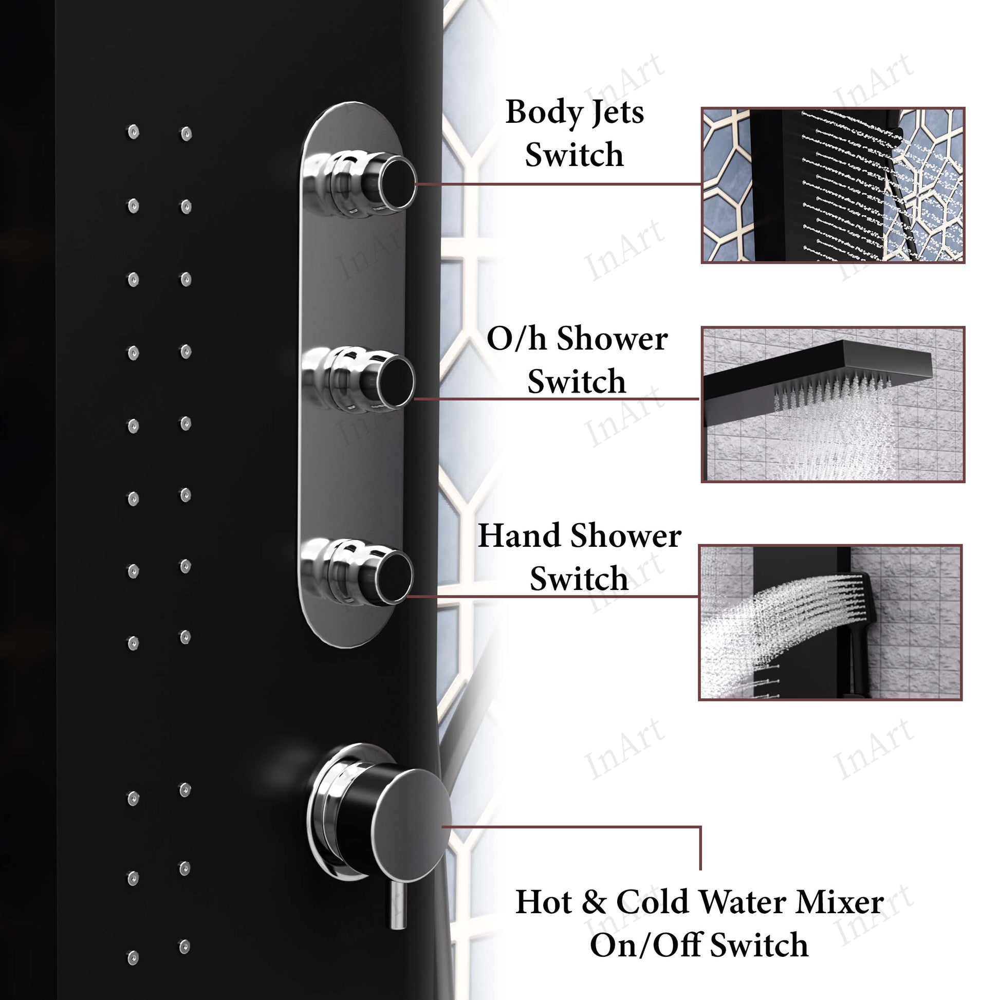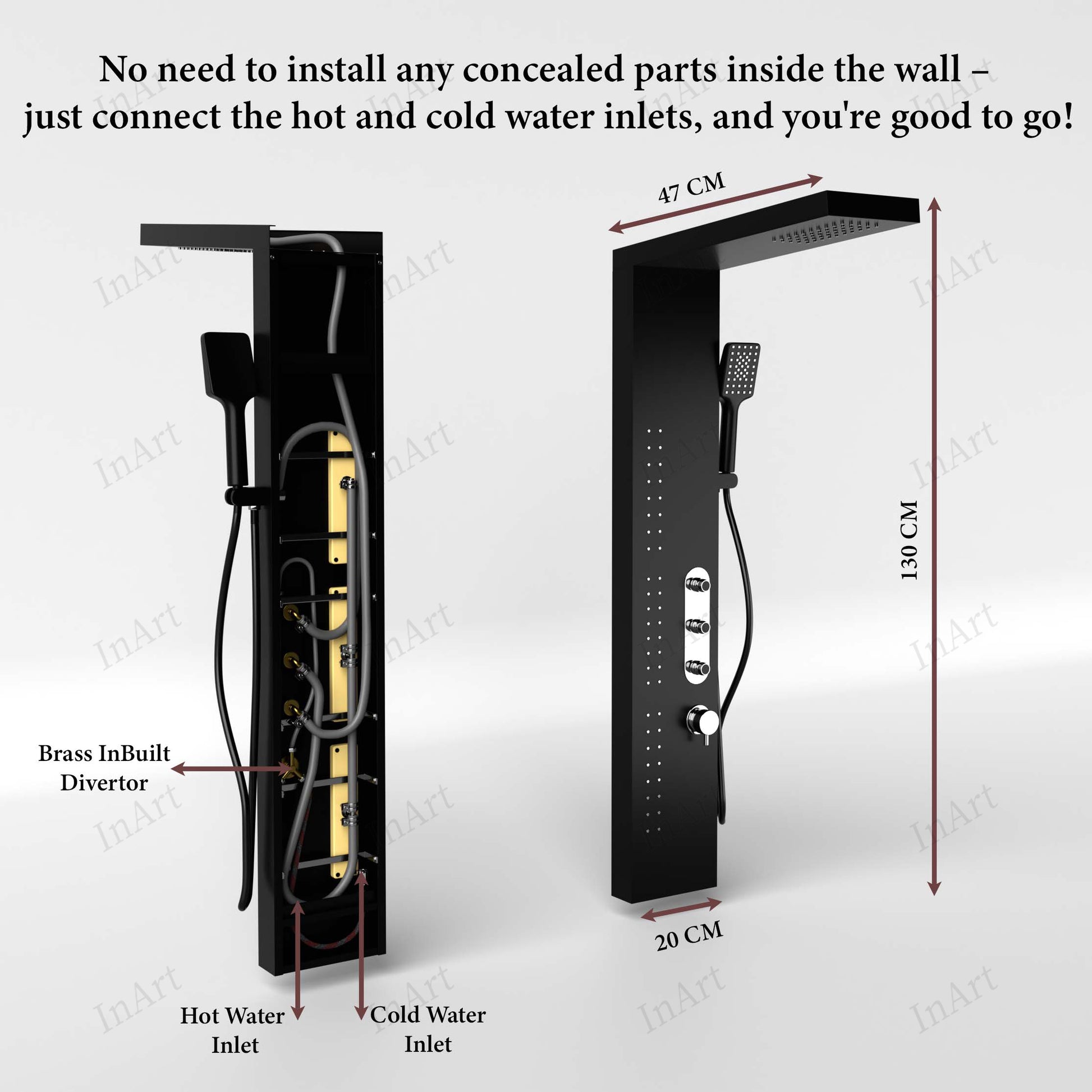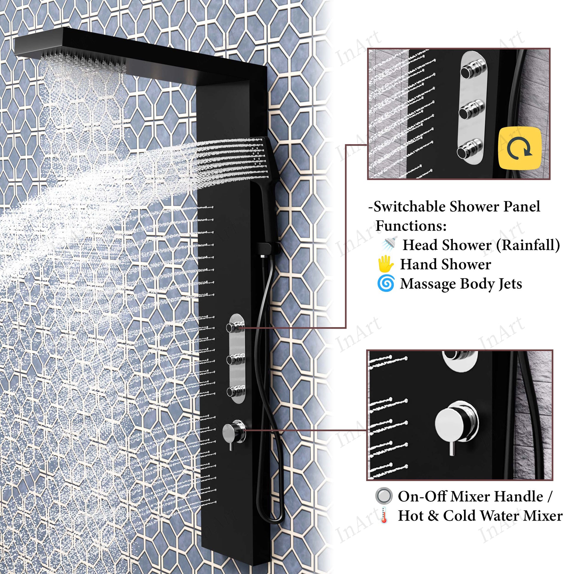 InArt 304 Grade Stainless Steel Shower Panel with Waterfall Outlet, Body Massage Spray, Handheld Shower, and Hot & Cold Mixer Jets - Black Satin Matt Finish SP066