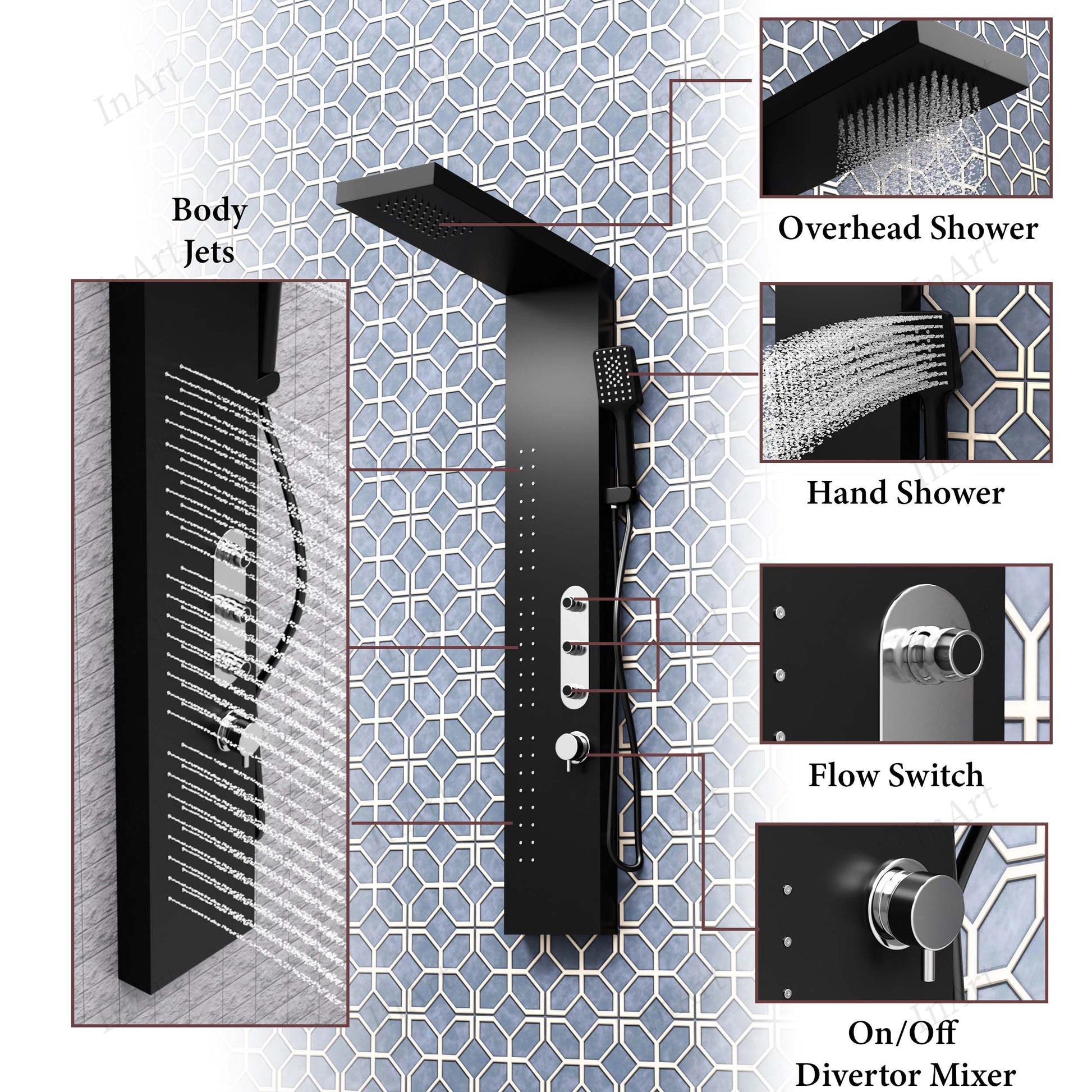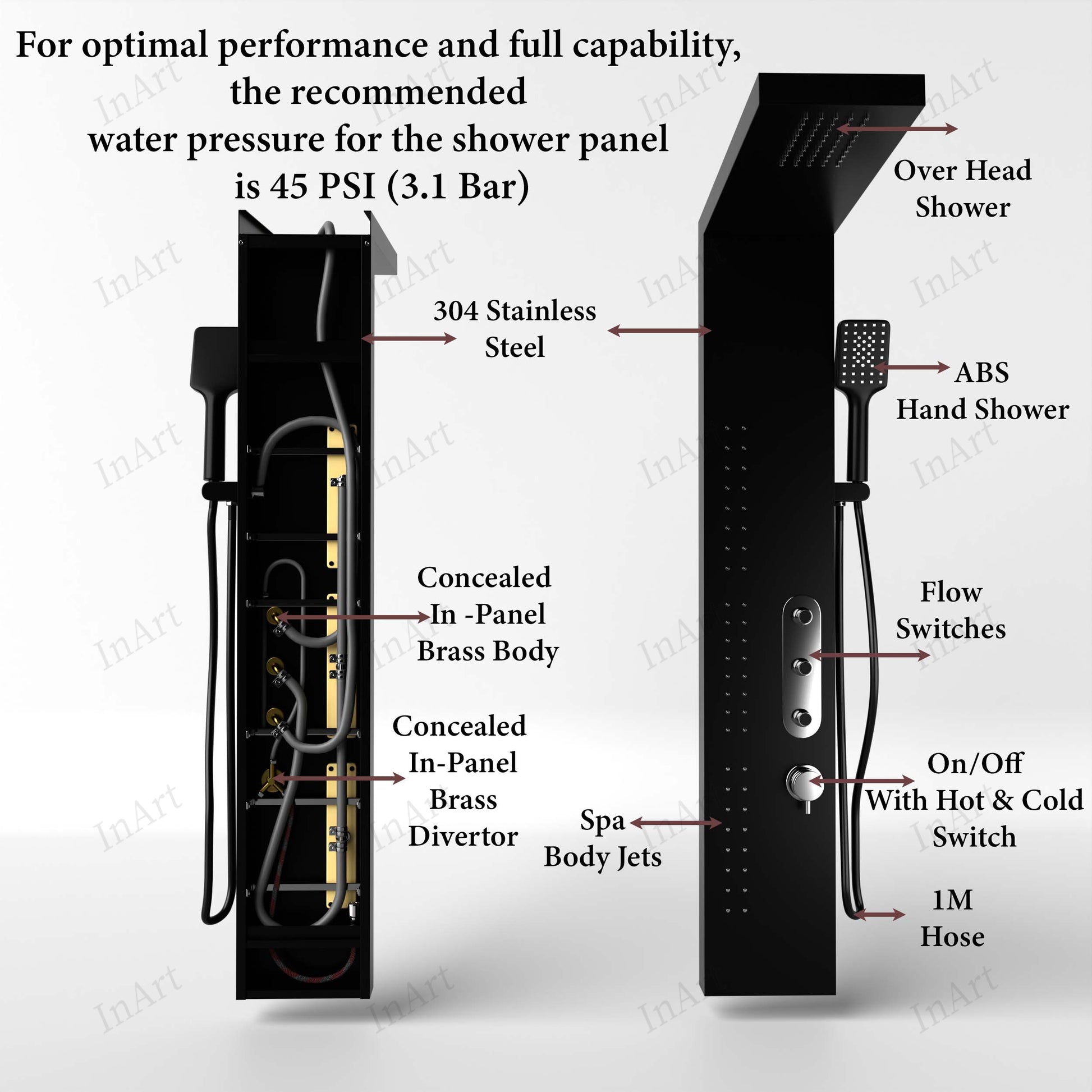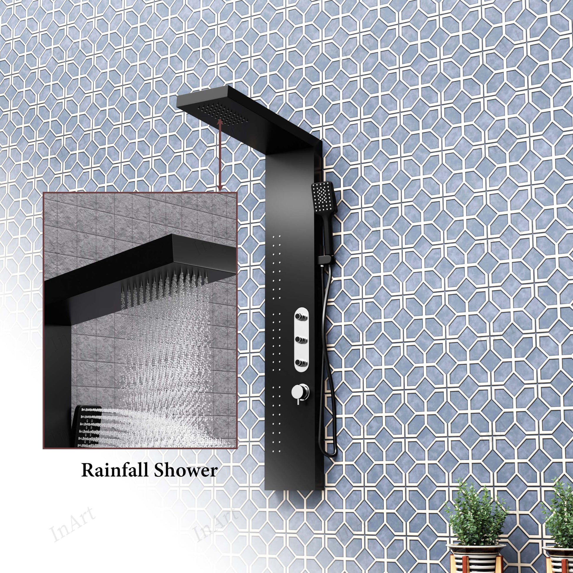 InArt 304 Grade Stainless Steel Shower Panel with Waterfall Outlet, Body Massage Spray, Handheld Shower, and Hot & Cold Mixer Jets - Black Satin Matt Finish SP066