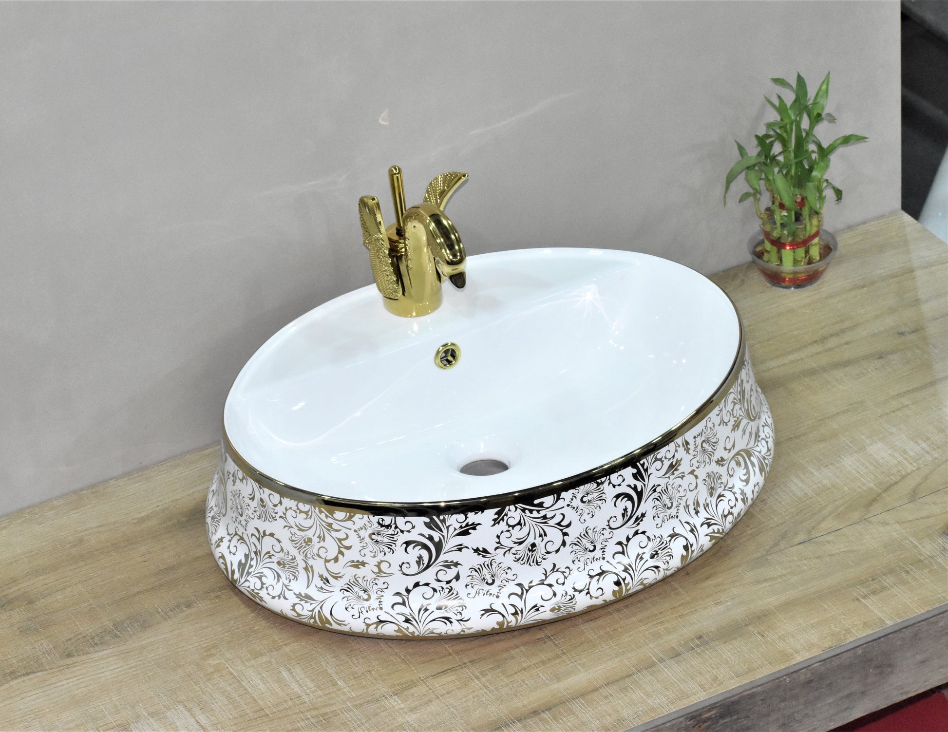 टेबल टॉप वॉश बेसिन सोने के रंग में ओवल