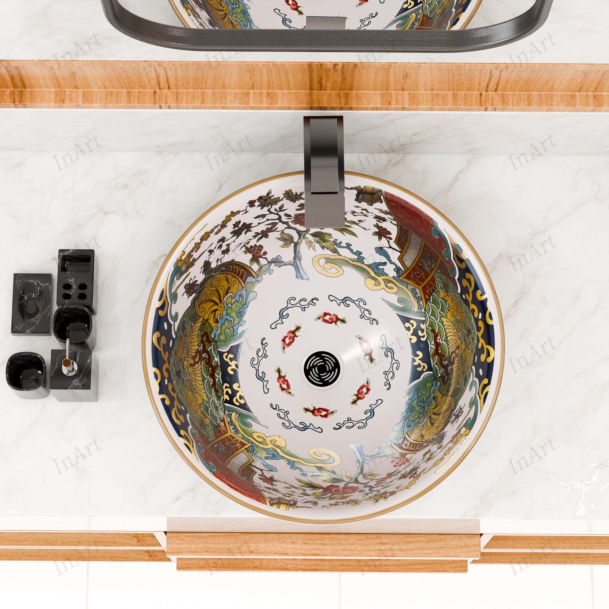 InArt Designer Moroccan Table Top Wash Basin – Wooden Color Ceramic Round Countertop Sink, 42 x 42 x 14 cm, Modern Bathroom Vanity Basin DW349