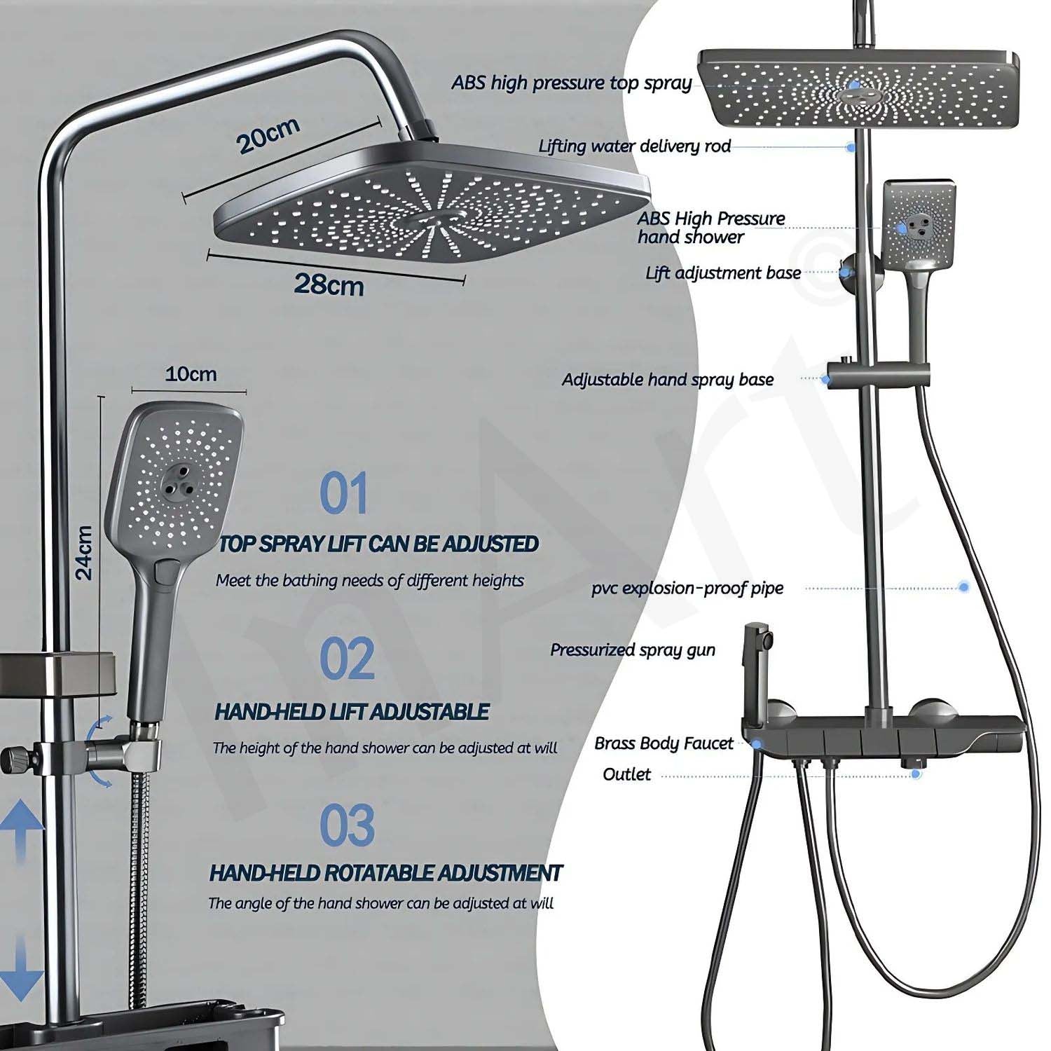 • Premium Stainless Steel Construction: Crafted from high-grade stainless steel, this shower panel boasts exceptional durability and corrosion resistance. Its glossy gun grey finish adds a touch of sophistication to any bathroom decor.
