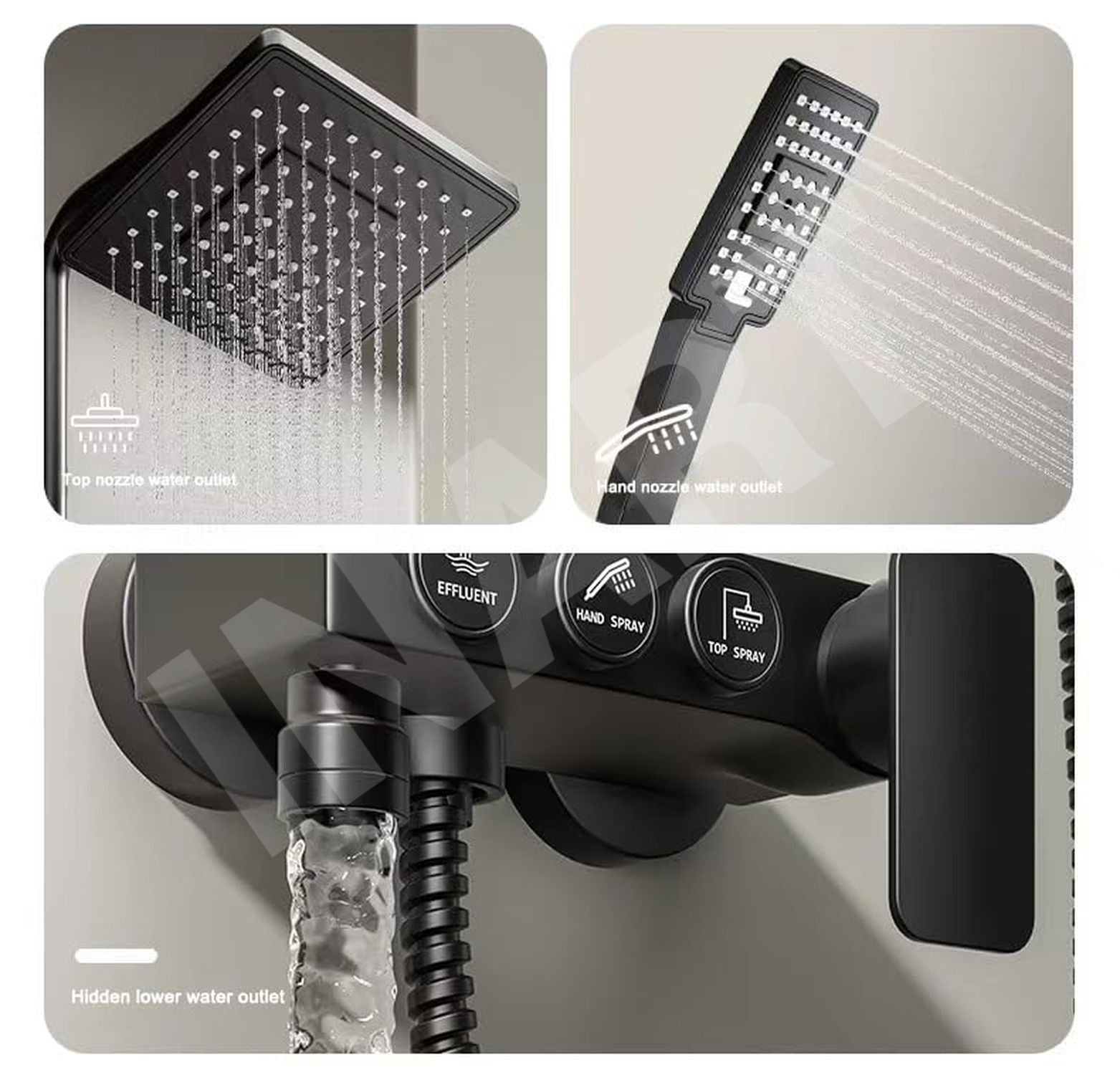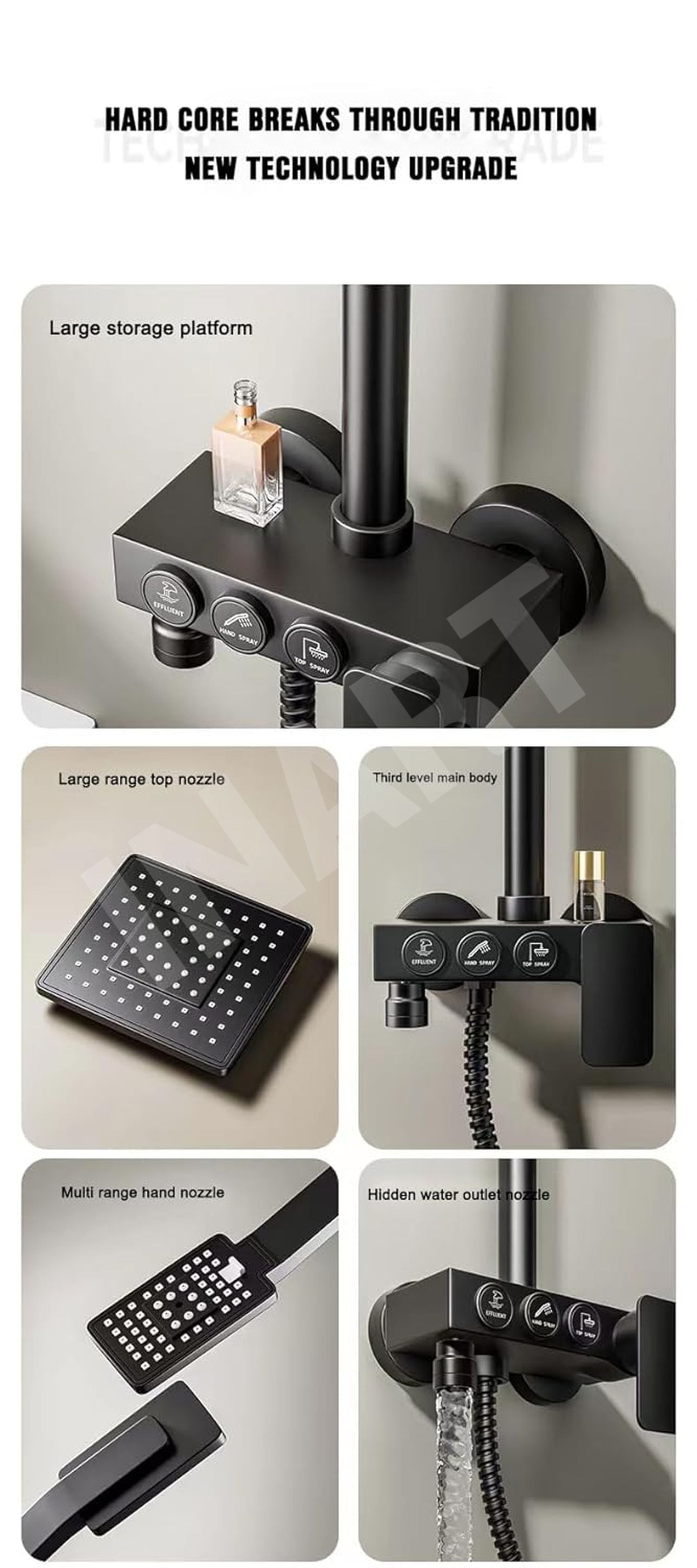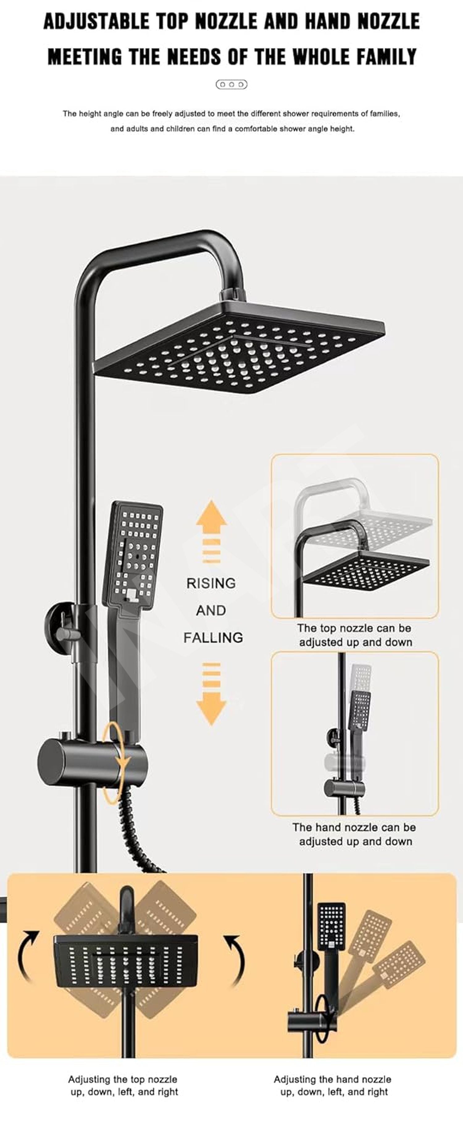 - Complete solution, ultimate convenience: Enjoy a comprehensive set that includes the hand shower, overhead square shower, and the entire shower panel, eliminating the need for additional purchases and offering ultimate convenience.