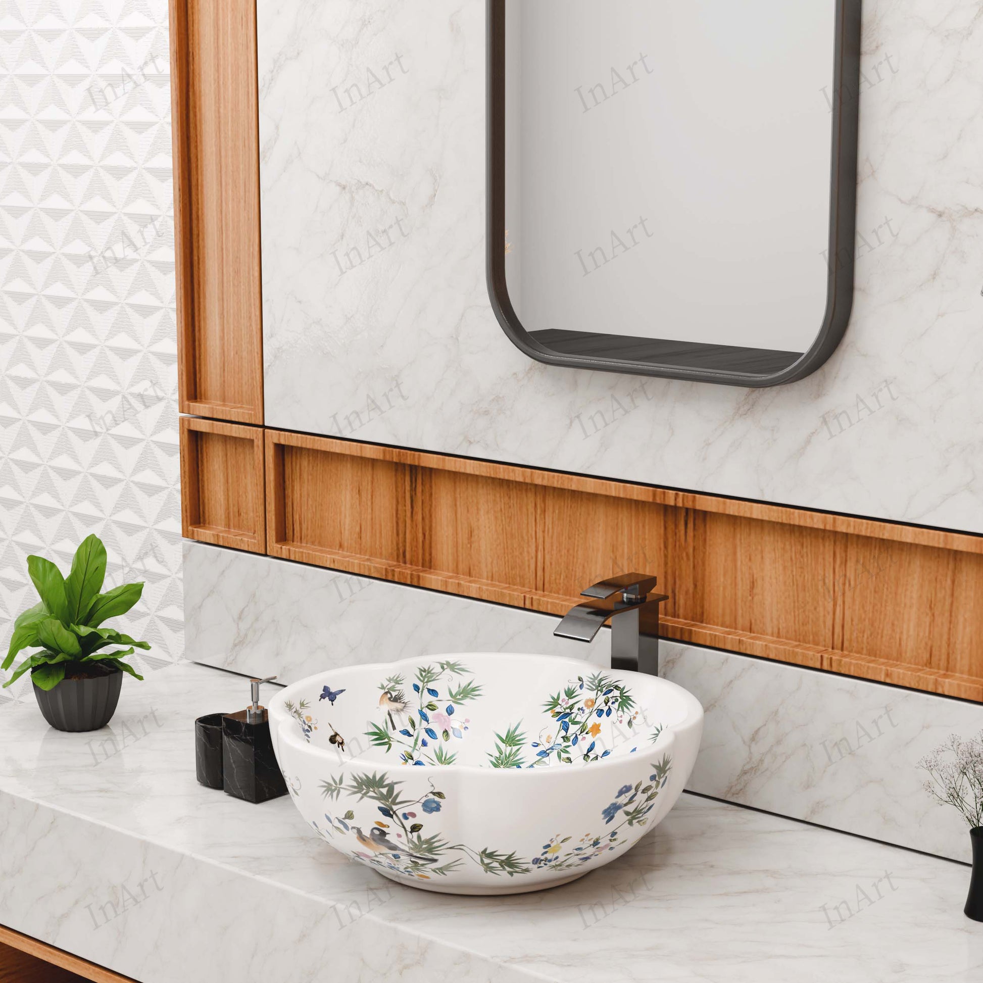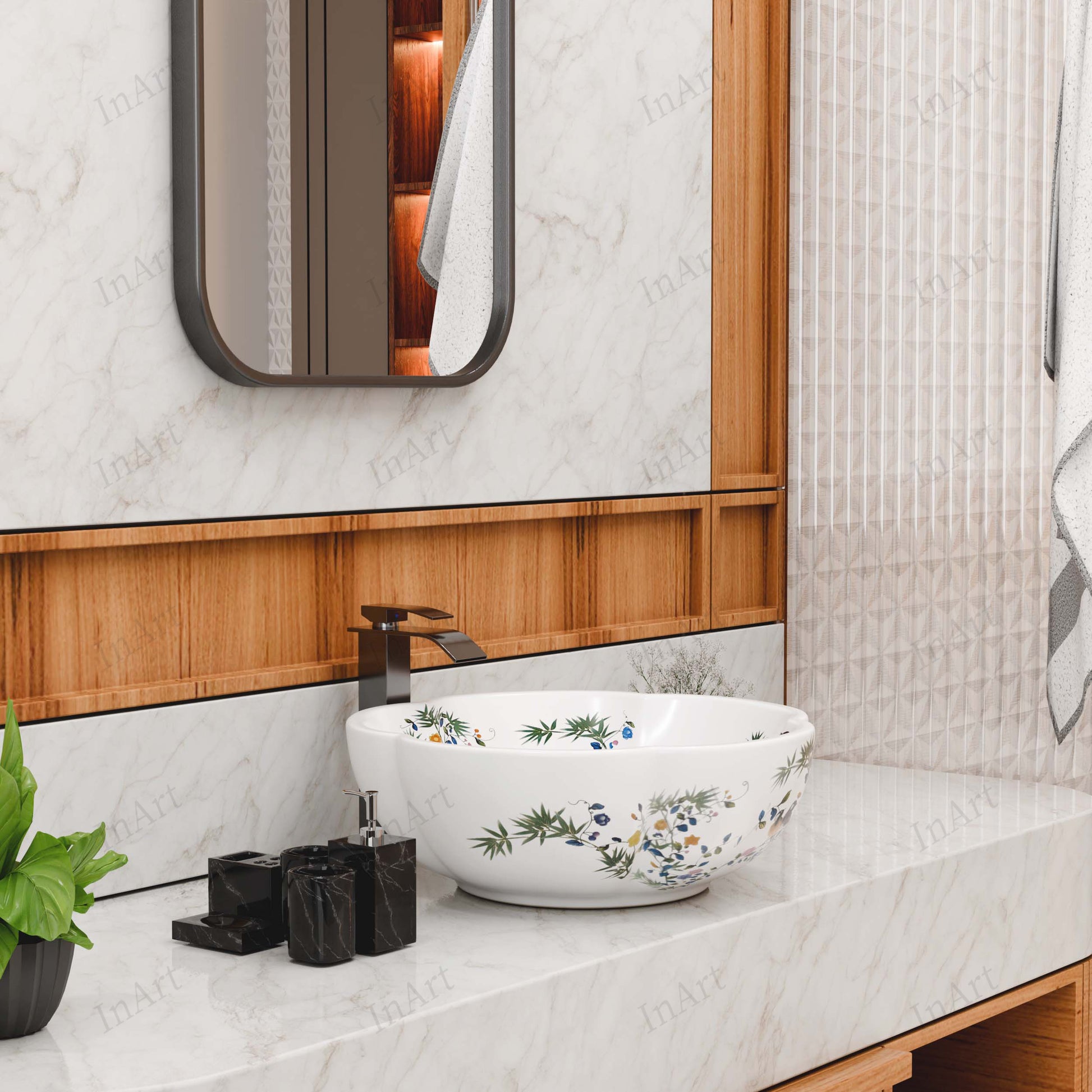 Redefine your bathroom aesthetics with the InArt Moroccan Ceramic White Floral Wash Basin. Its artistic design, premium craftsmanship, and practical features make it a perfect addition to modern and traditional interiors alike.
