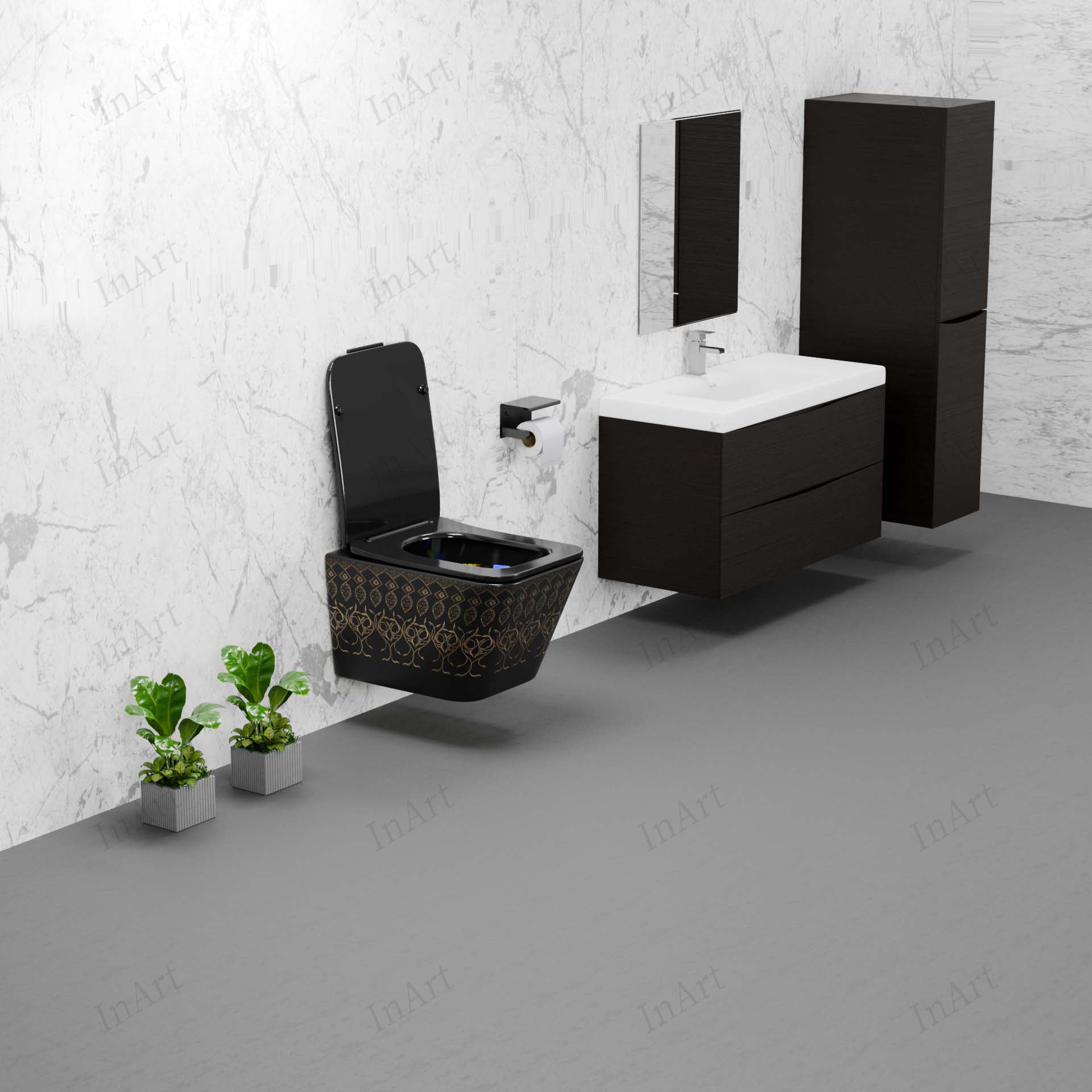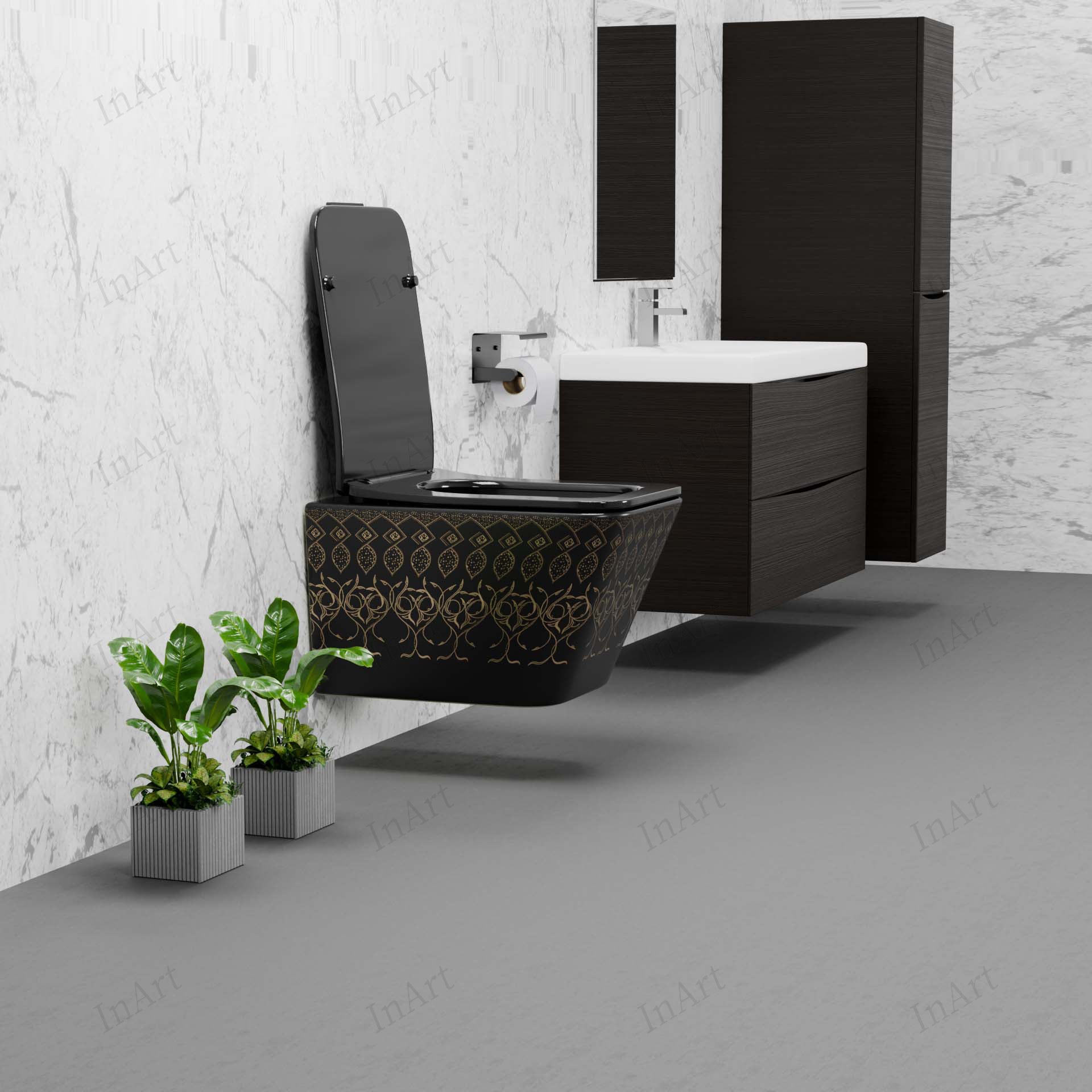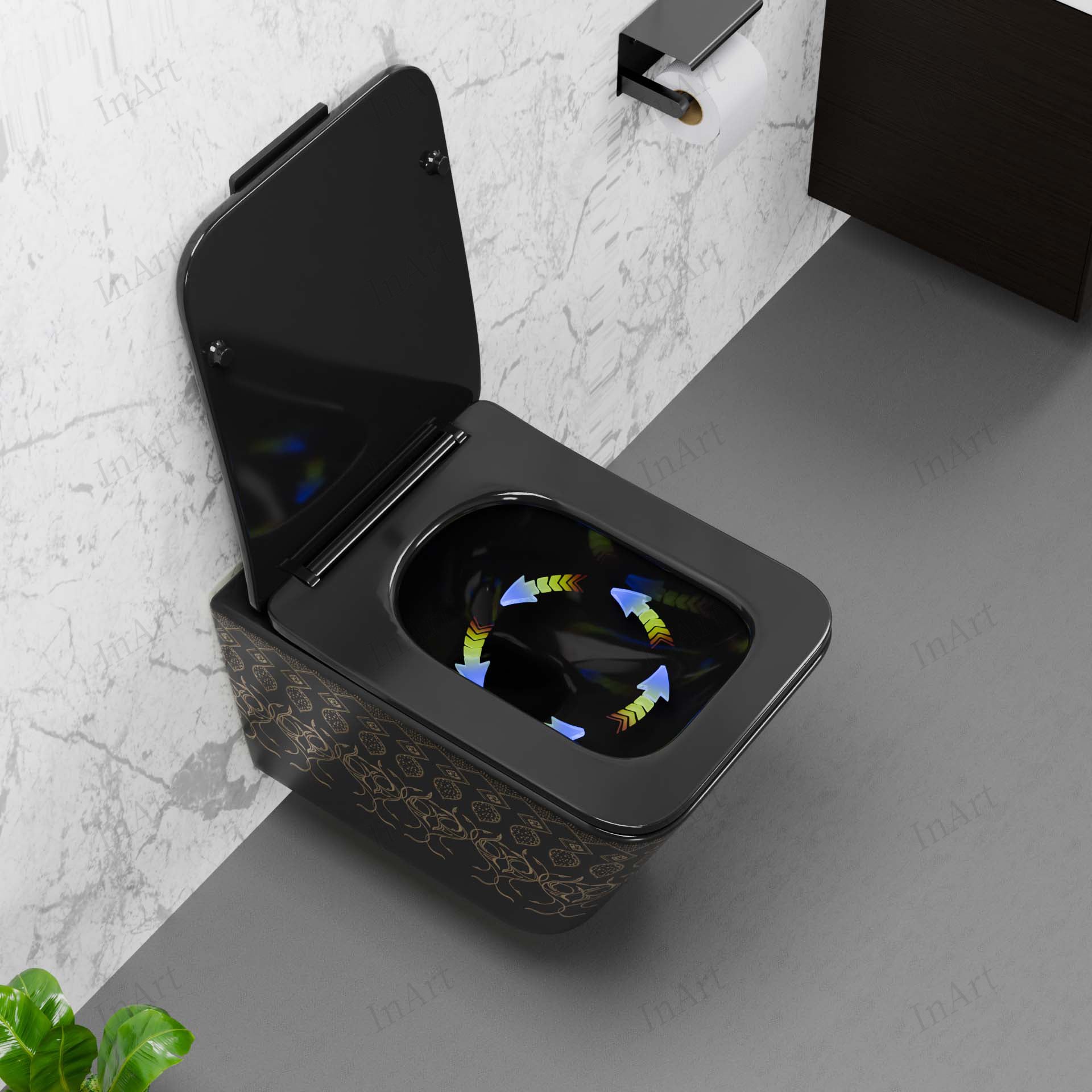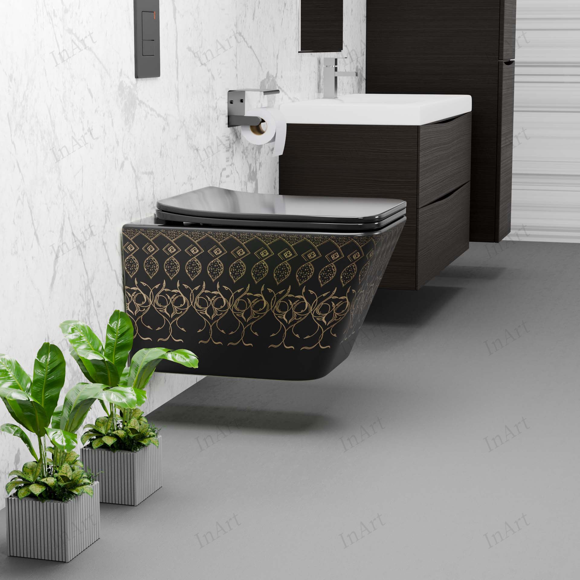 Transform your daily routine with the InArt Obsidian Black Gold Wall Mounted Western Toilet—where elegance, hygiene, and practicality come together effortlessly.