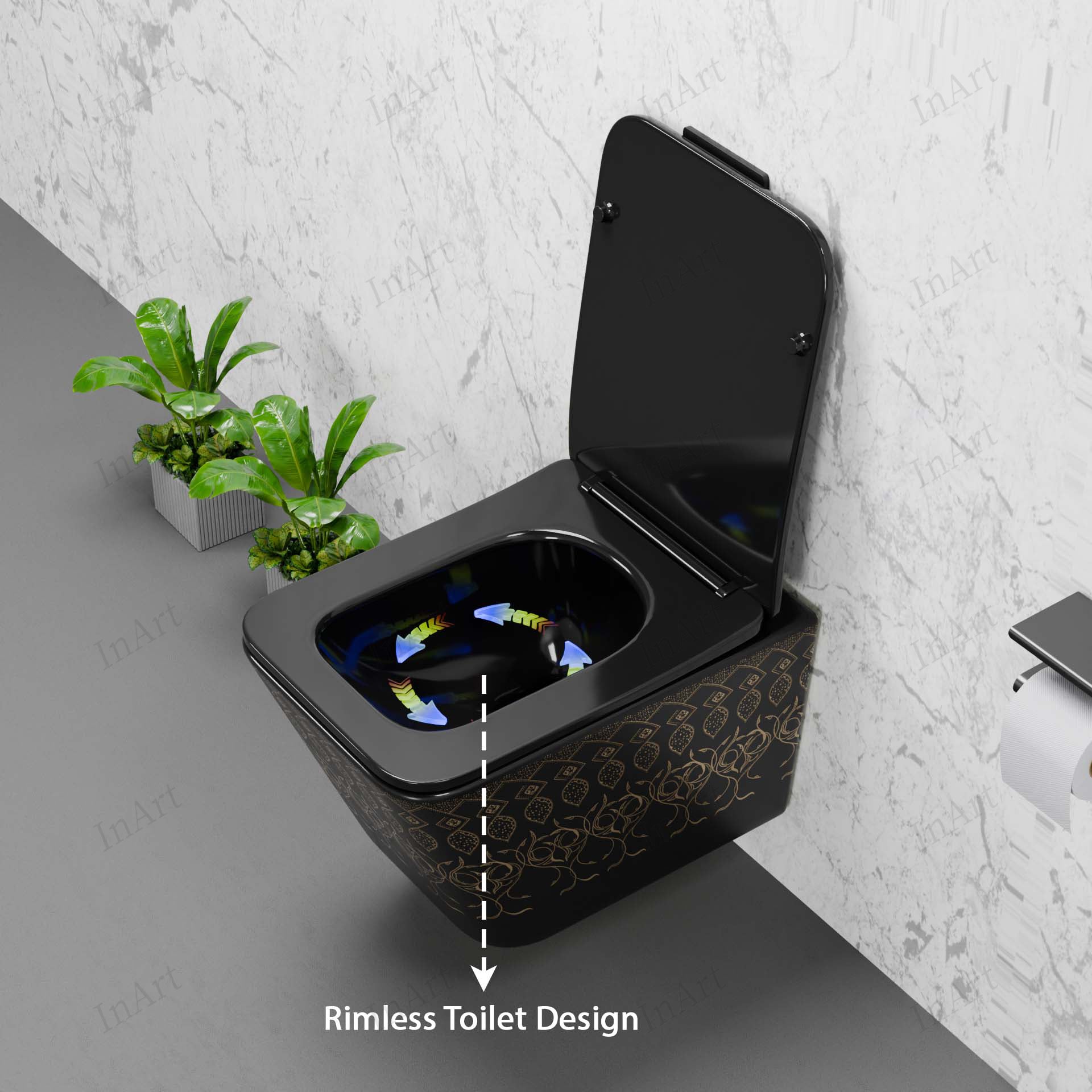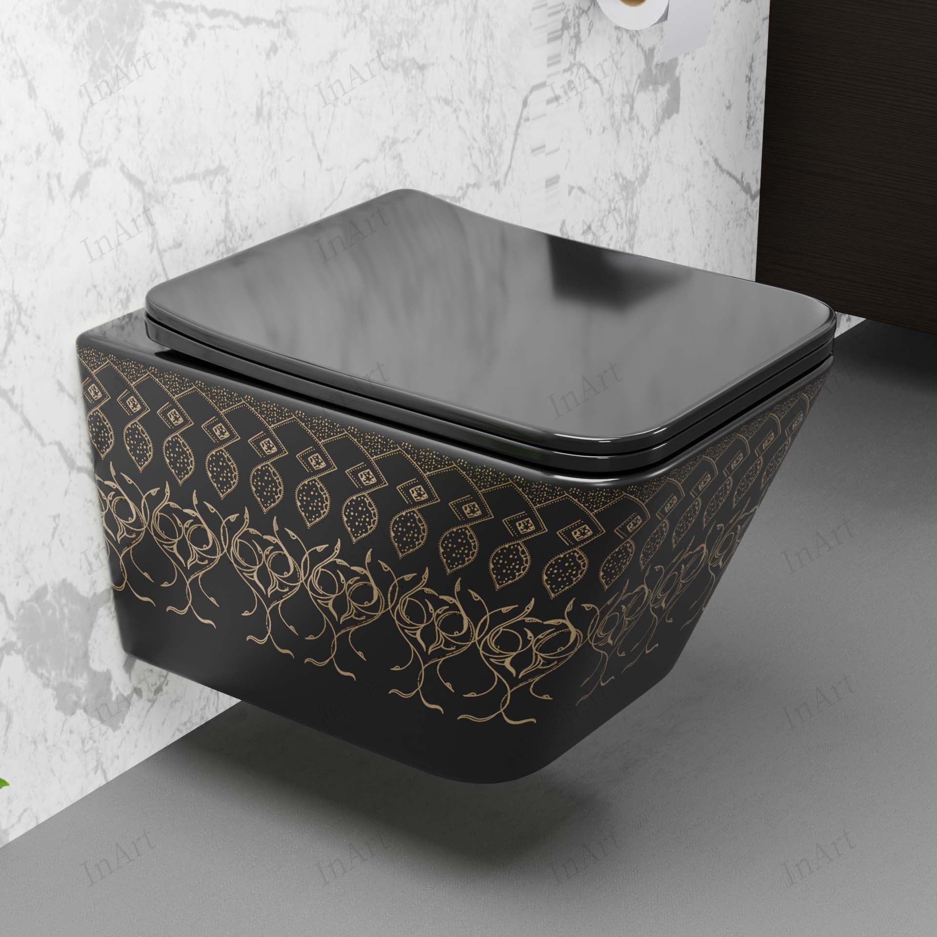 Upgrade your bathroom with the InArt European Style Wall Mounted Toilet Commode in a striking Black Gold finish. Designed to enhance modern Indian bathrooms, this wall-hung toilet combines style, space-saving installation, and hygienic performance.