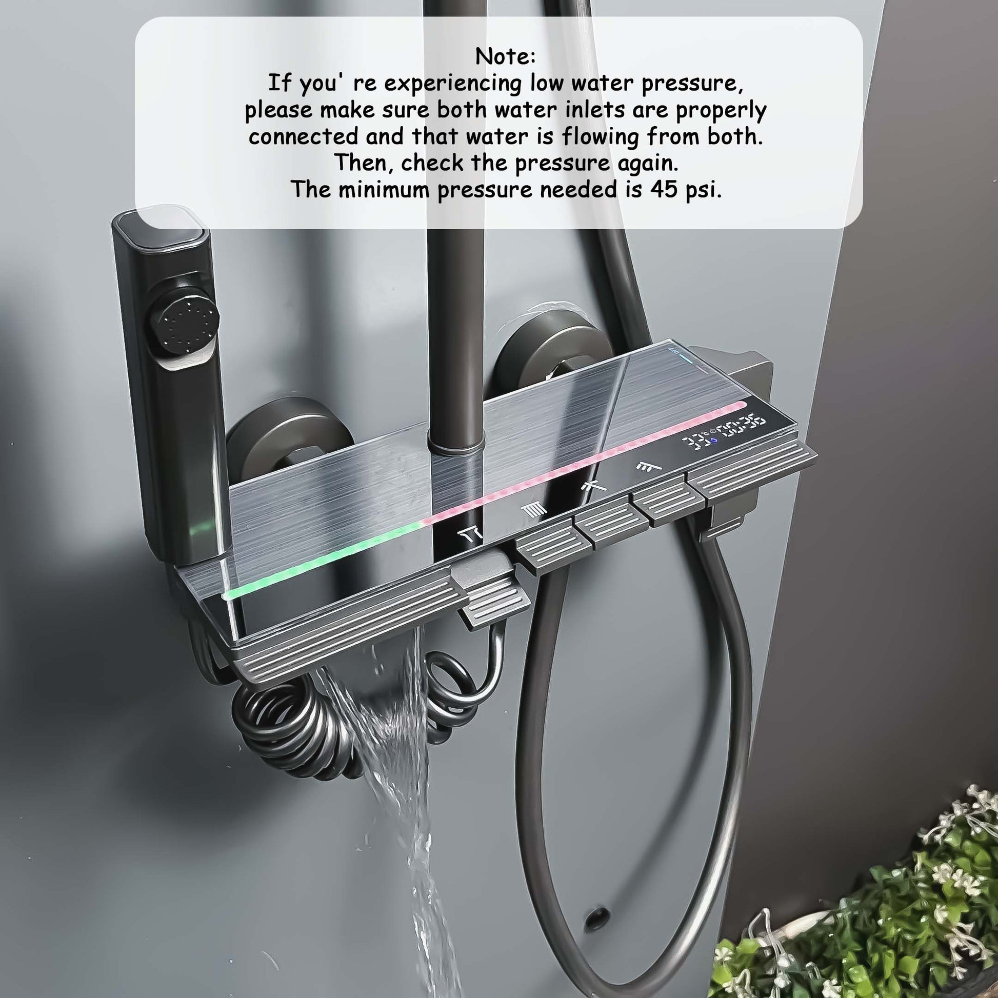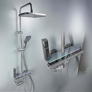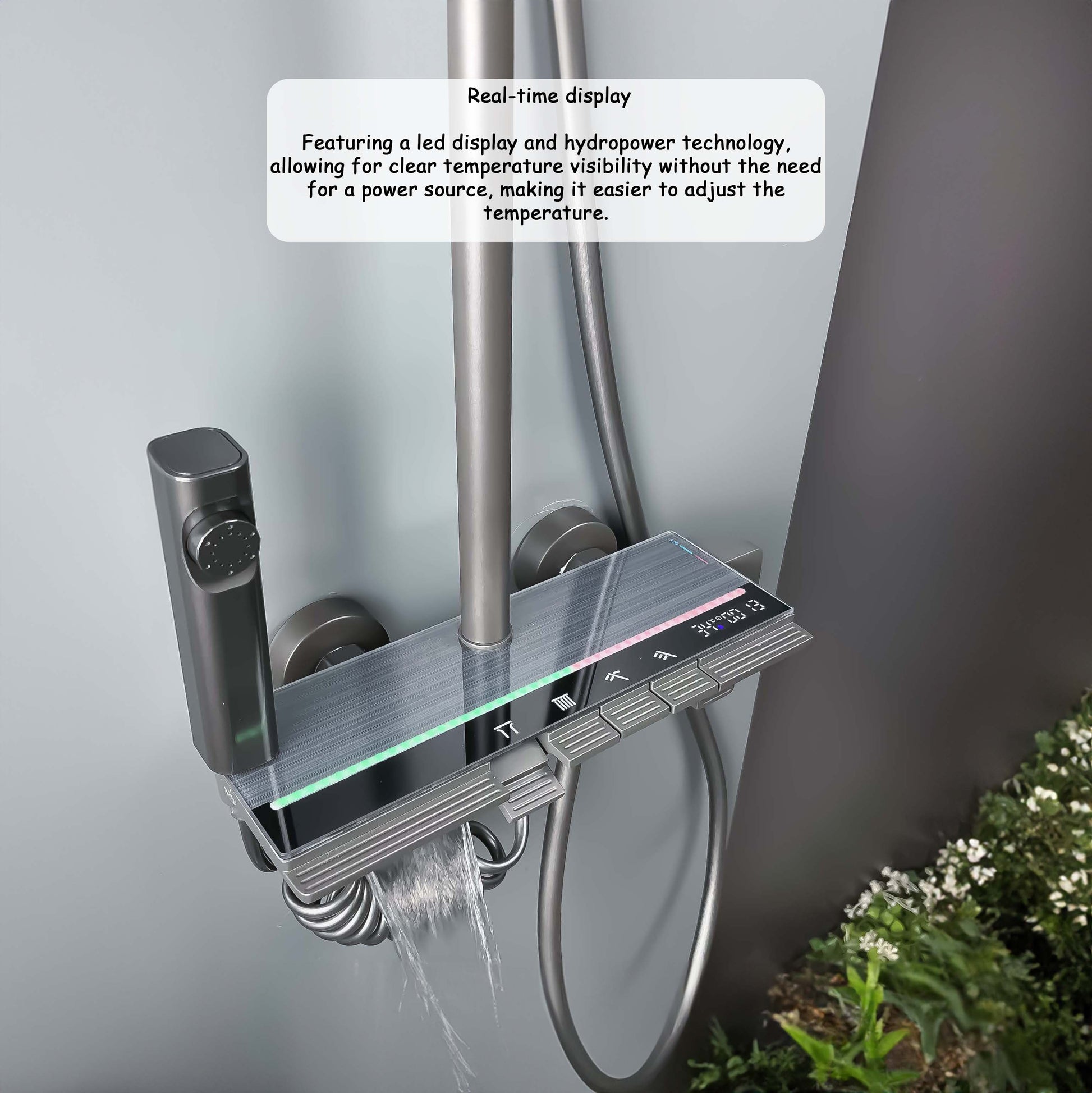 Upgrade your bathroom experience with the InArt Thermostatic Shower System, designed to offer luxury and practicality in every use. This elegant gun grey shower system comes equipped with a range of intelligent features, including a digital LED display that shows both water temperature and shower duration. Powered by water flow, this system requires no batteries, ensuring a seamless and hassle-free experience.