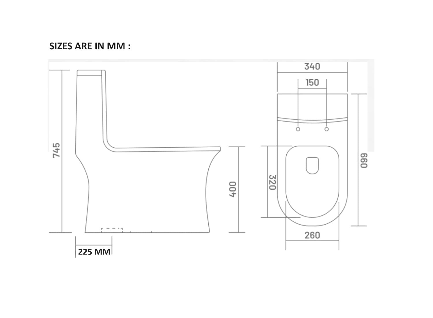 - इस वॉटर क्लोजेट का आकार 74 x 67 x 37 सेमी है और एस-ट्रैप के लिए दूरी 8 इंच है (इस वॉटर क्लोजेट को स्थापित करने के लिए पिछली दीवार से ट्रैप होल सेंटर तक की न्यूनतम आवश्यक दूरी है।)