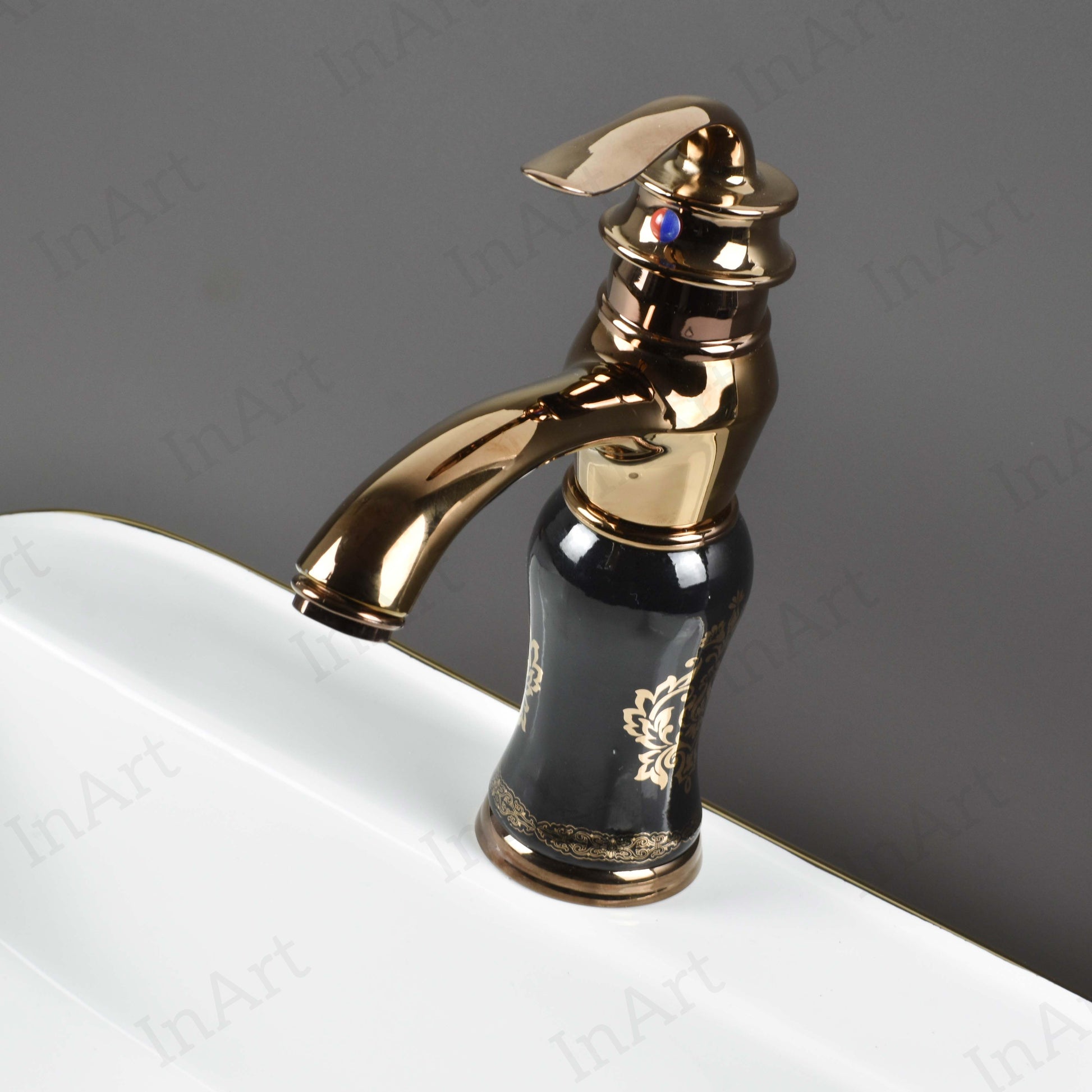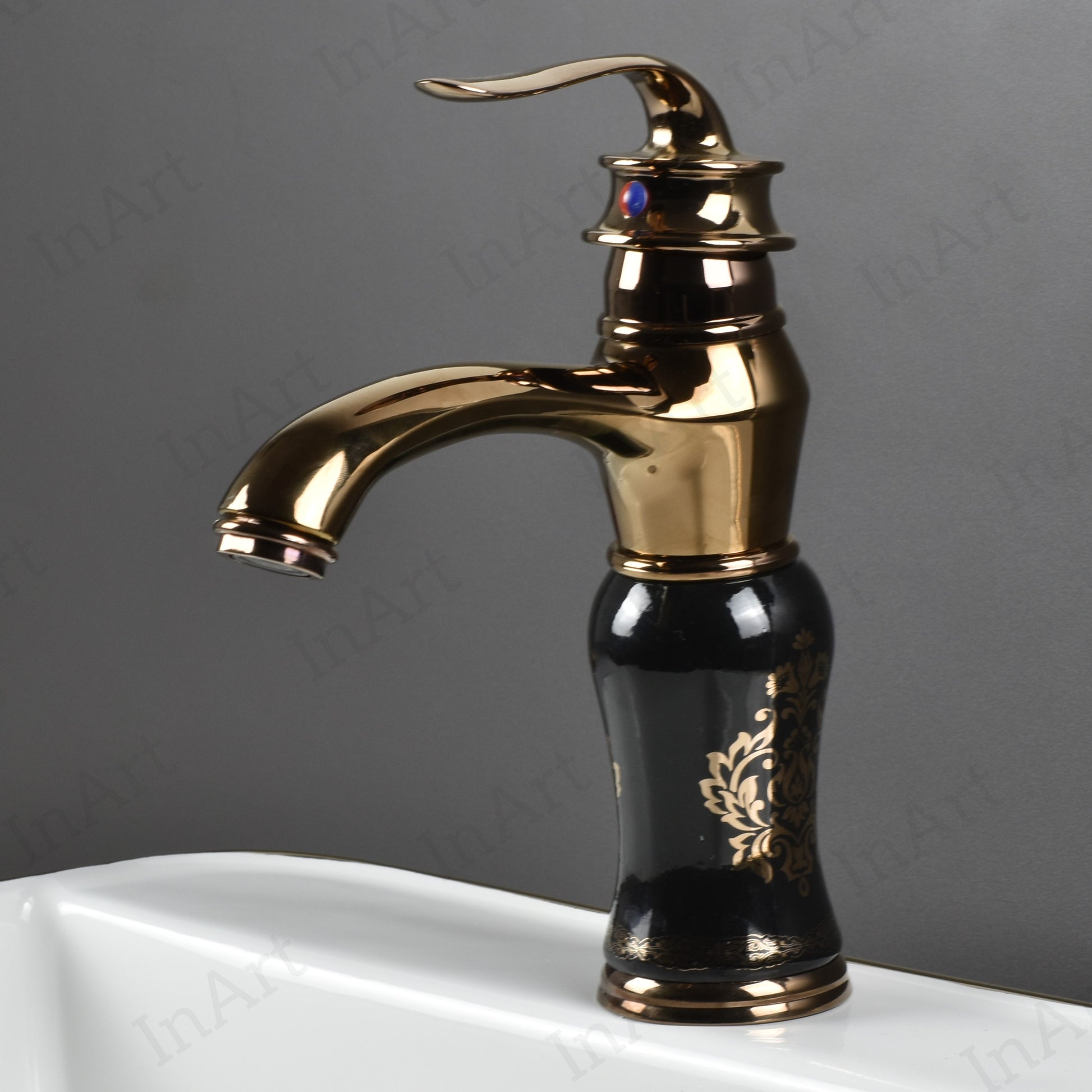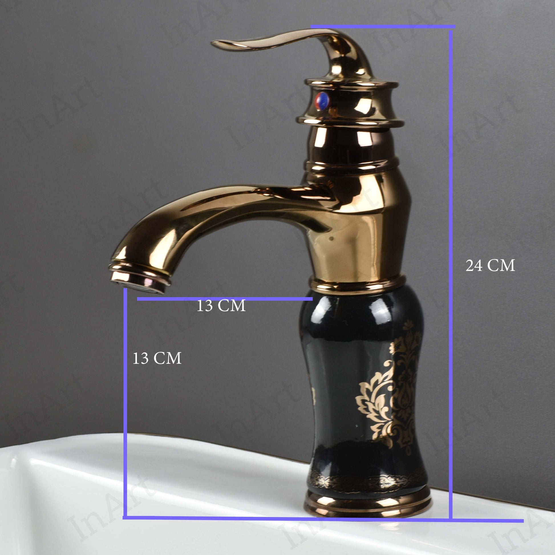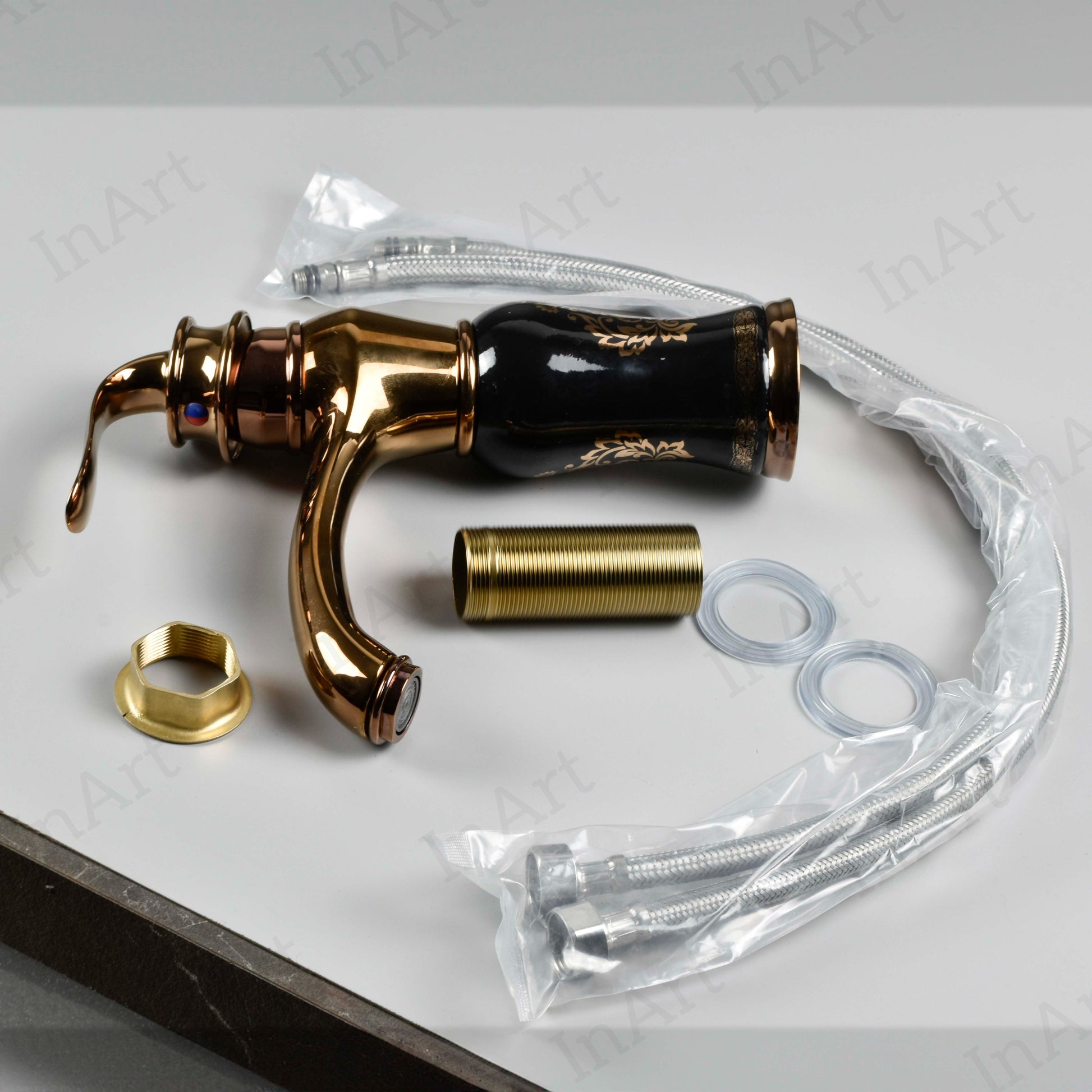 InArt Black Rose Gold Basin Pillar Cock Tap - Hot & Cold Mixer, Single Handle, Waterfall Design, Table Mount BF003