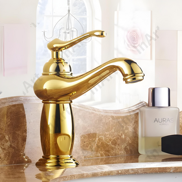 InArt Brass with Gold Finish Basin Pillar Cock Tap - Hot & Cold Mixer, Single Handle, Waterfall Design, Deck Mount BF011