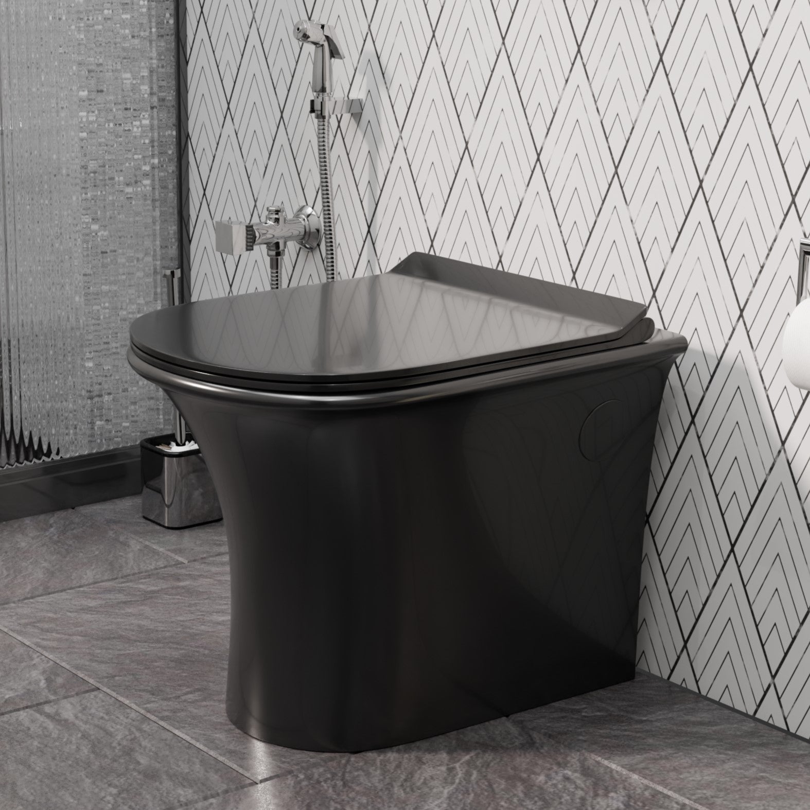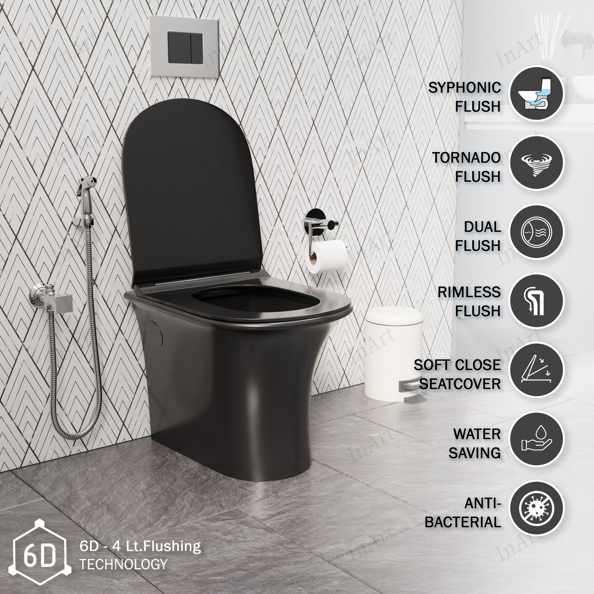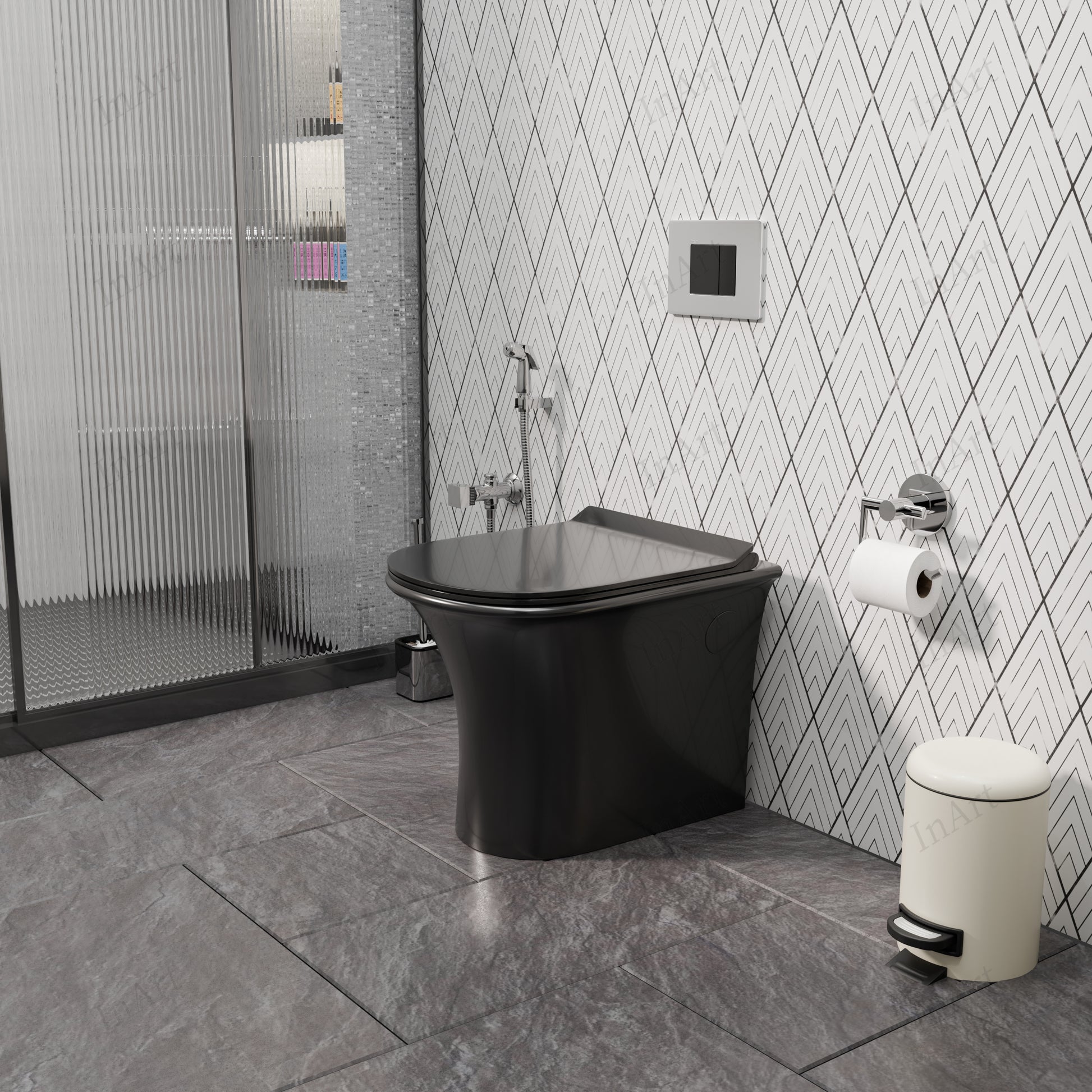 The InArt Comfort Height Rimless Back to Wall Commode in glossy black ceramic is designed for compact Indian bathrooms where style, hygiene, and comfort matter. With a sleek one-piece design, concealed plumbing, and a 4" S-Trap outlet, it offers a modern look without compromising functionality.
