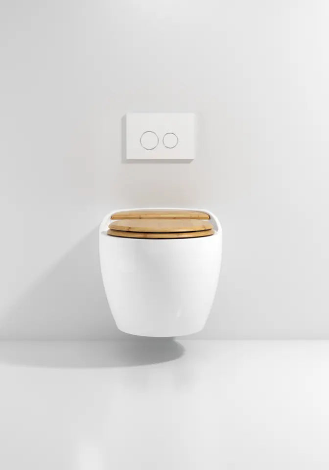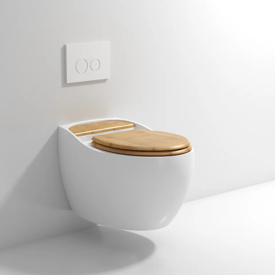 Bathroom Ceramic Commode Wall Mount Clean Rim Wooden Seat Cover White Color