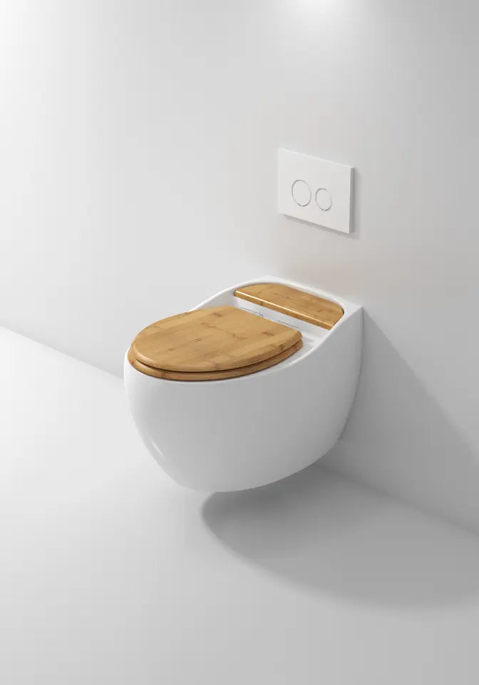 InArt Ceramic Wall Hung or Wall Mounted Designer (Clean Rim) Rimless Water Closet Toilet with Soft Close Wooden Finish Seat Color DWH016