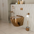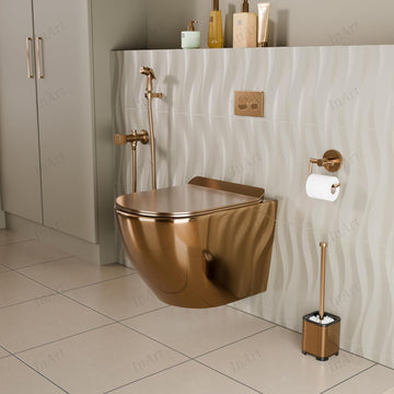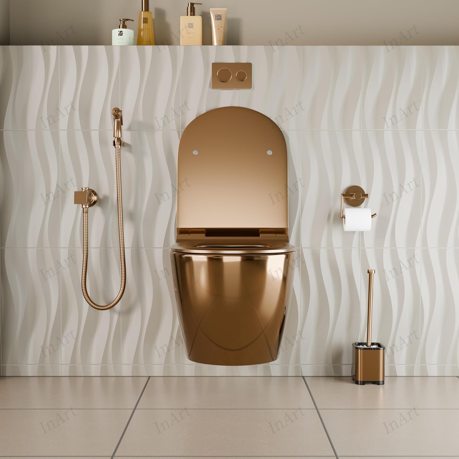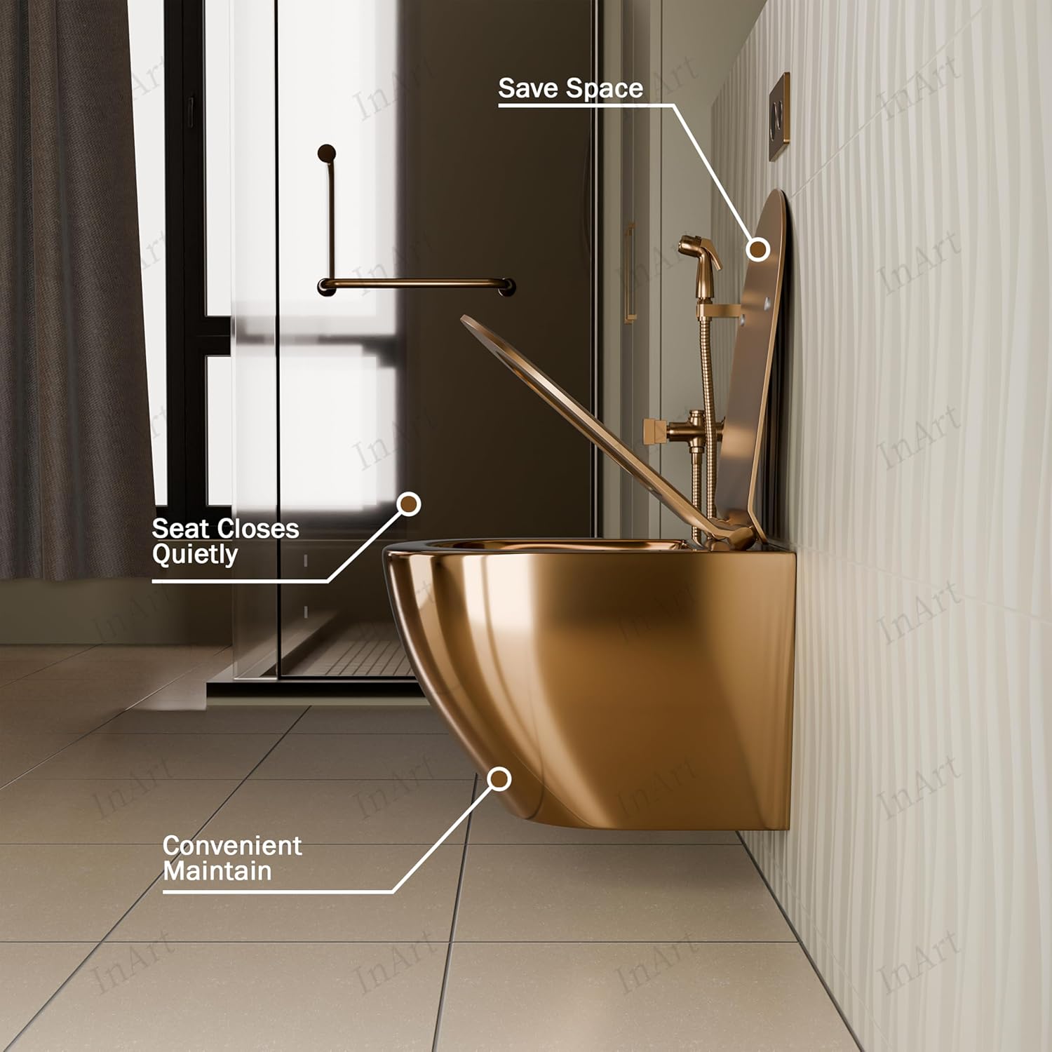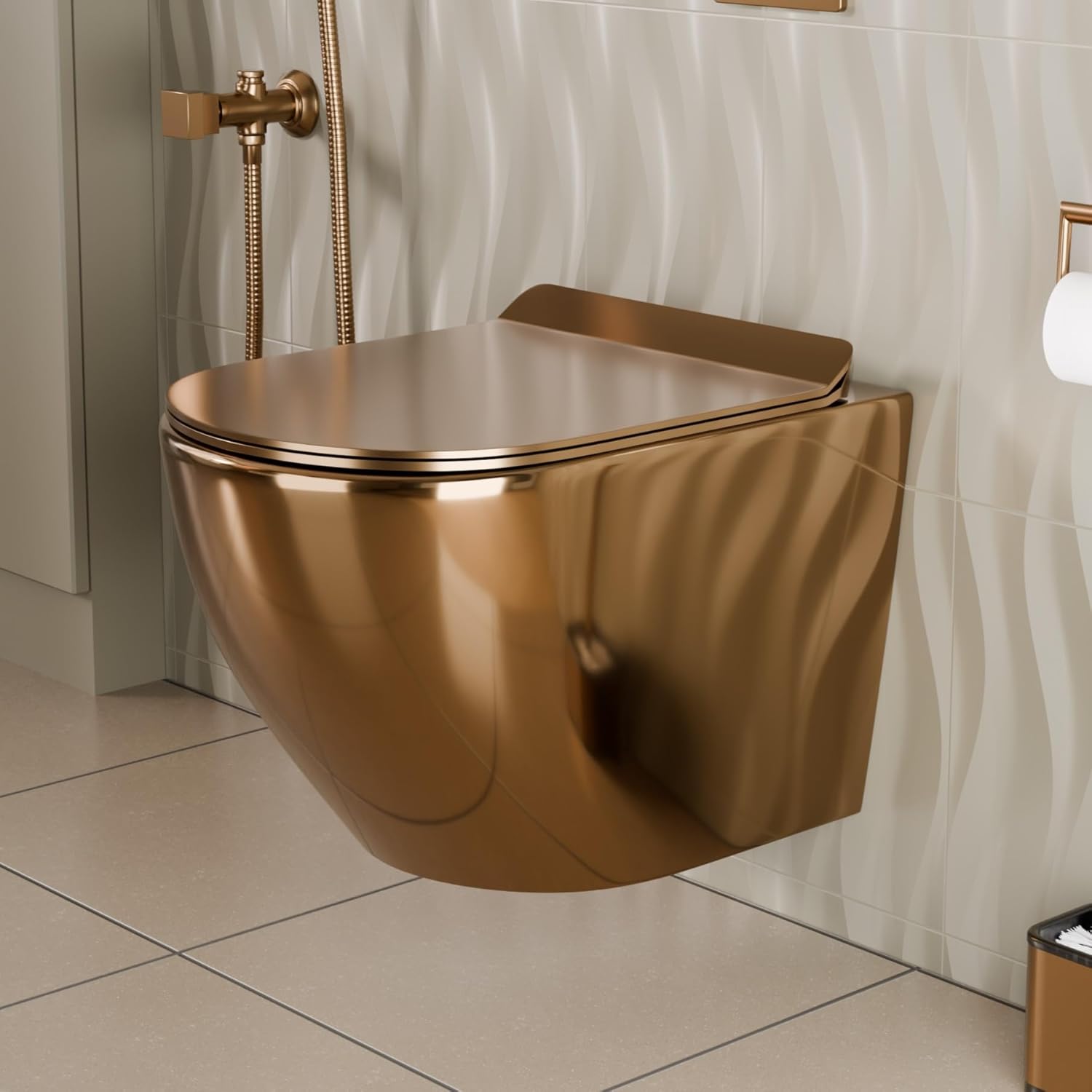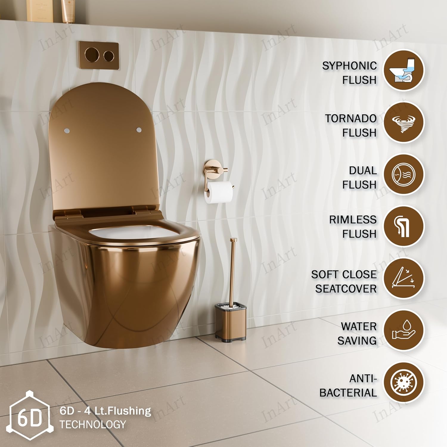 InArt Ceramic Wall Hung or Wall Mounted Designer (Clean Rim) Rimless Water Closet Toilet with Soft Seat Cover Rose Gold DWH022