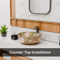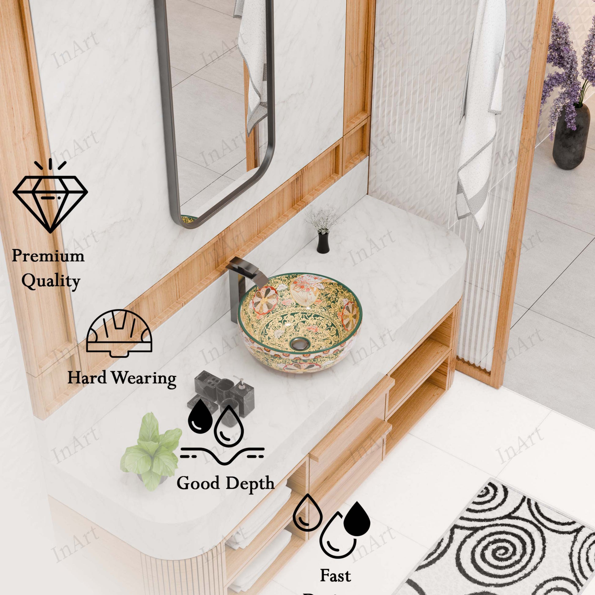 InArt Designer Moroccan Table Top Wash Basin – Green Multi Color Ceramic Countertop Sink, 42 x 42 x 14 cm, Round Washbasin for Bathroom & Vanity DW347
