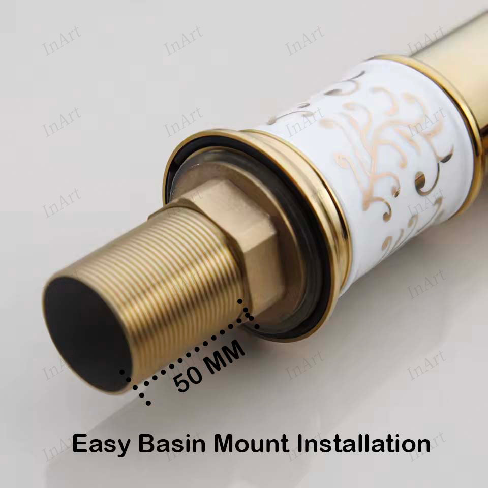 Transform your bathroom or kitchen with the InArt White Gold Glossy Finish Basin Pillar Cock Tap Faucet. This stunning faucet combines the elegance of gold with the purity of white, creating a luxurious and modern look. The waterfall design and single-handle mixer ensure ease of use and precise water control.