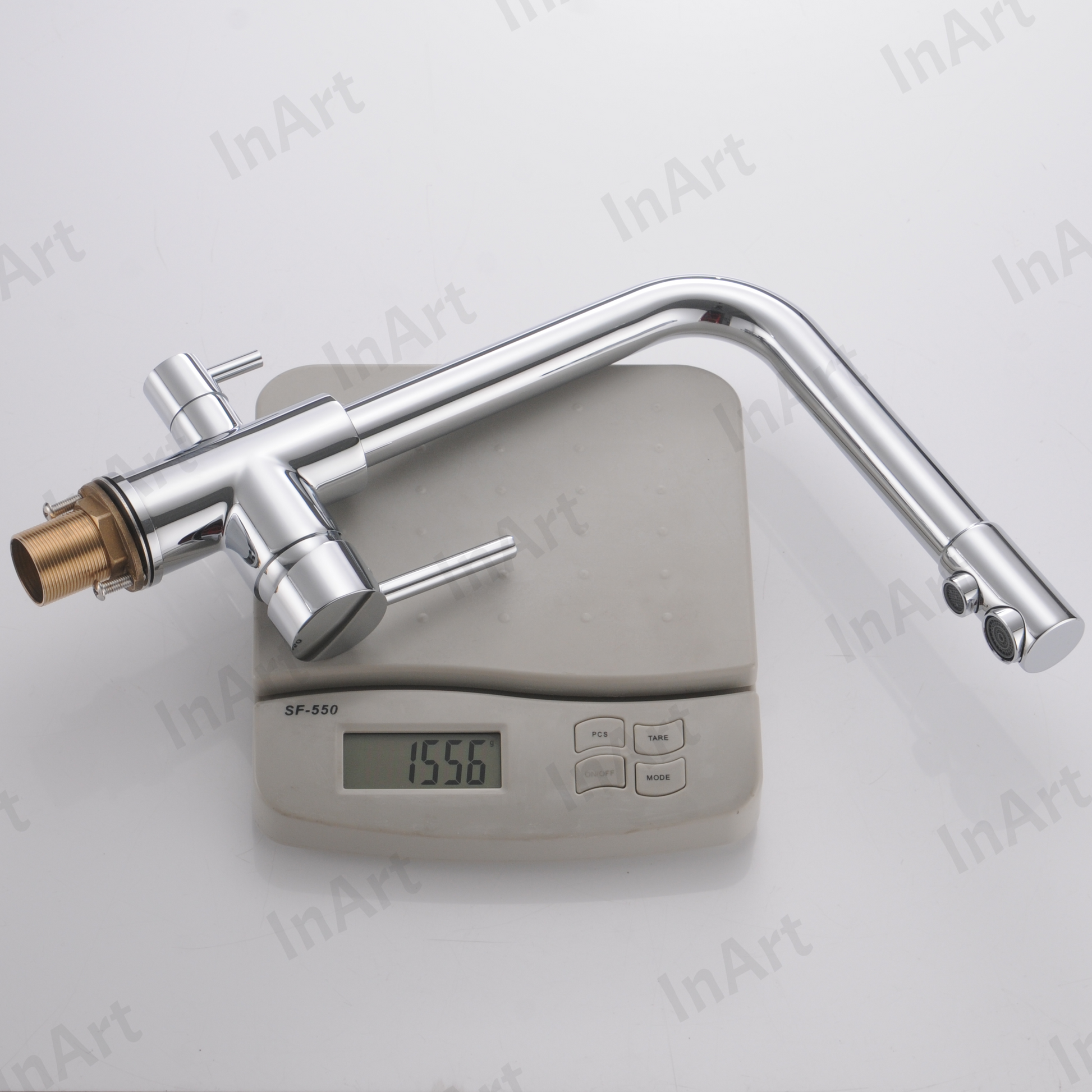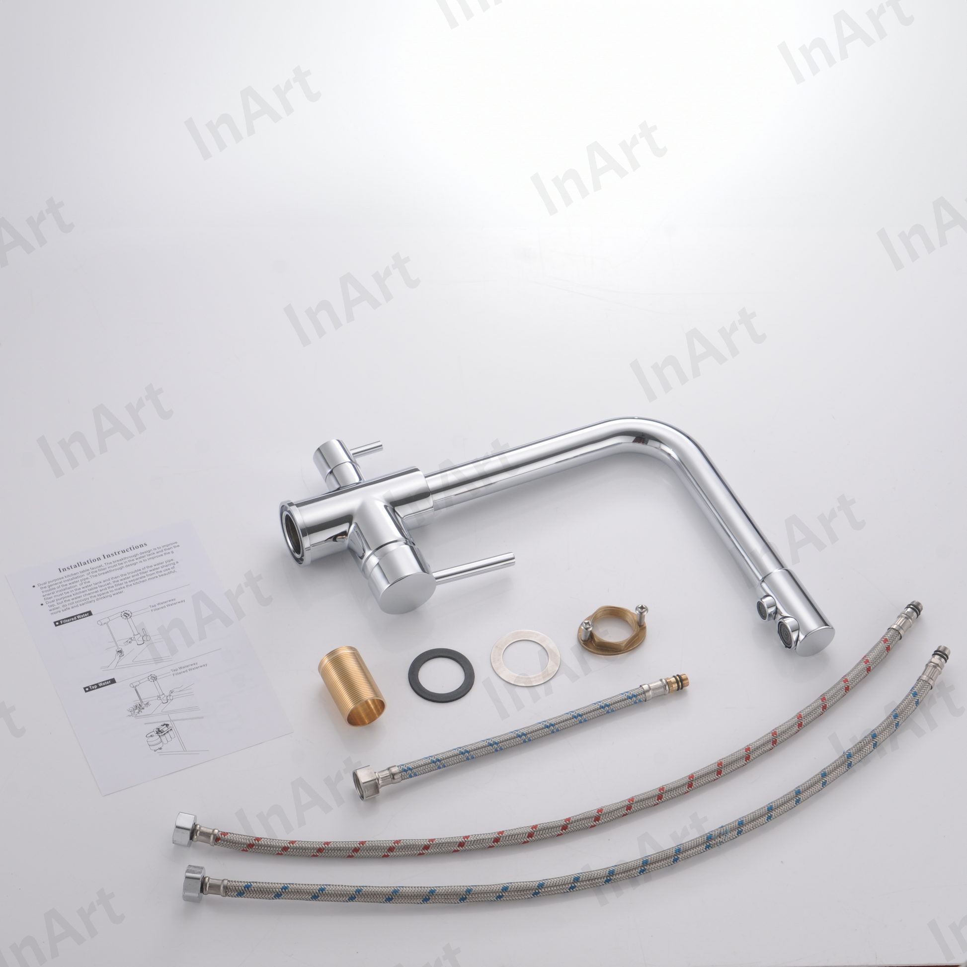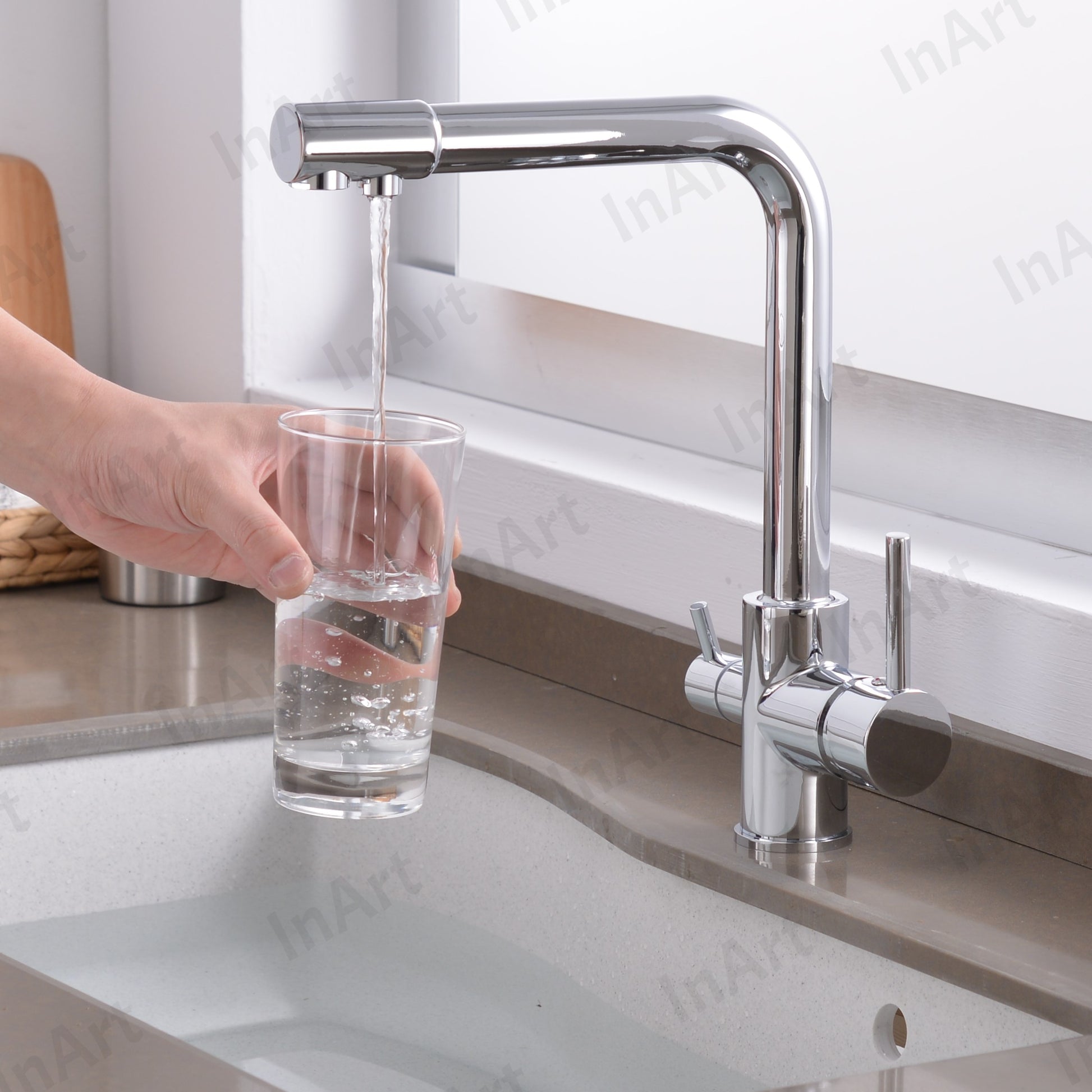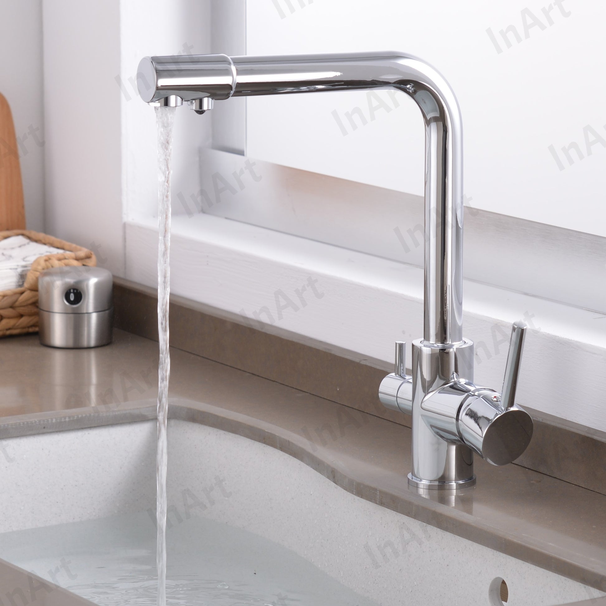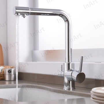 The InArt Brass Chrome Kitchen Faucet is a sleek and modern addition to any kitchen. Suitable for family kitchens, commercial kitchens, and shopping mall restrooms, this faucet features a 3-way water filter system alongside a regular water tap. The chrome finish offers a polished look that complements any decor.