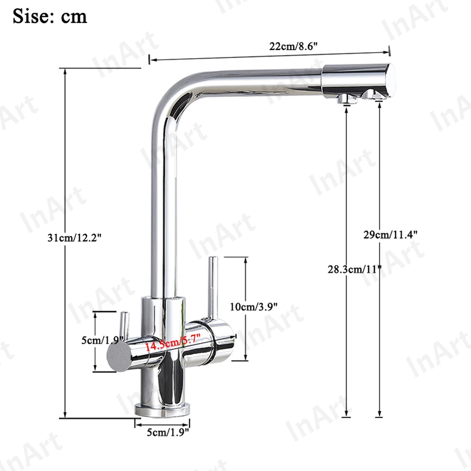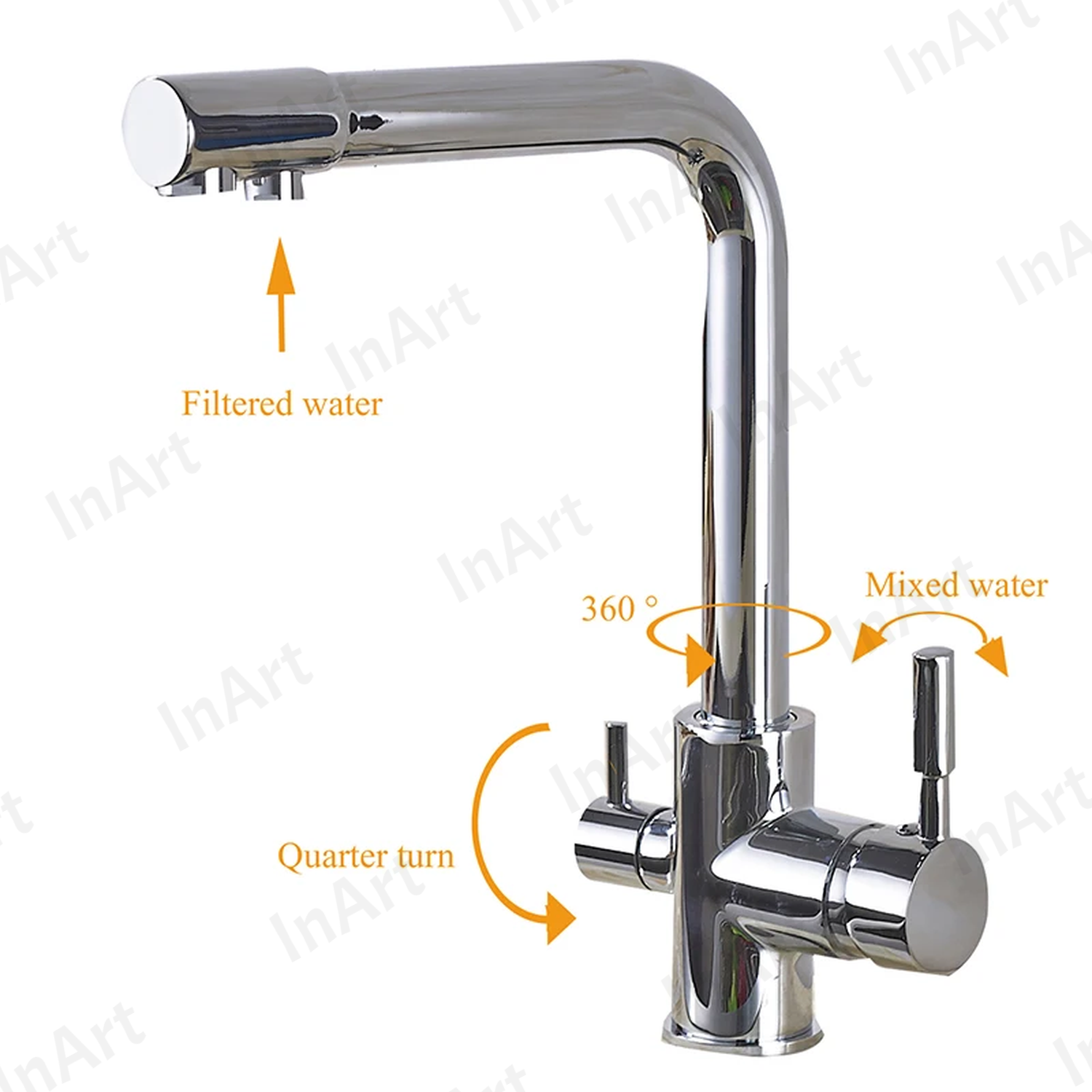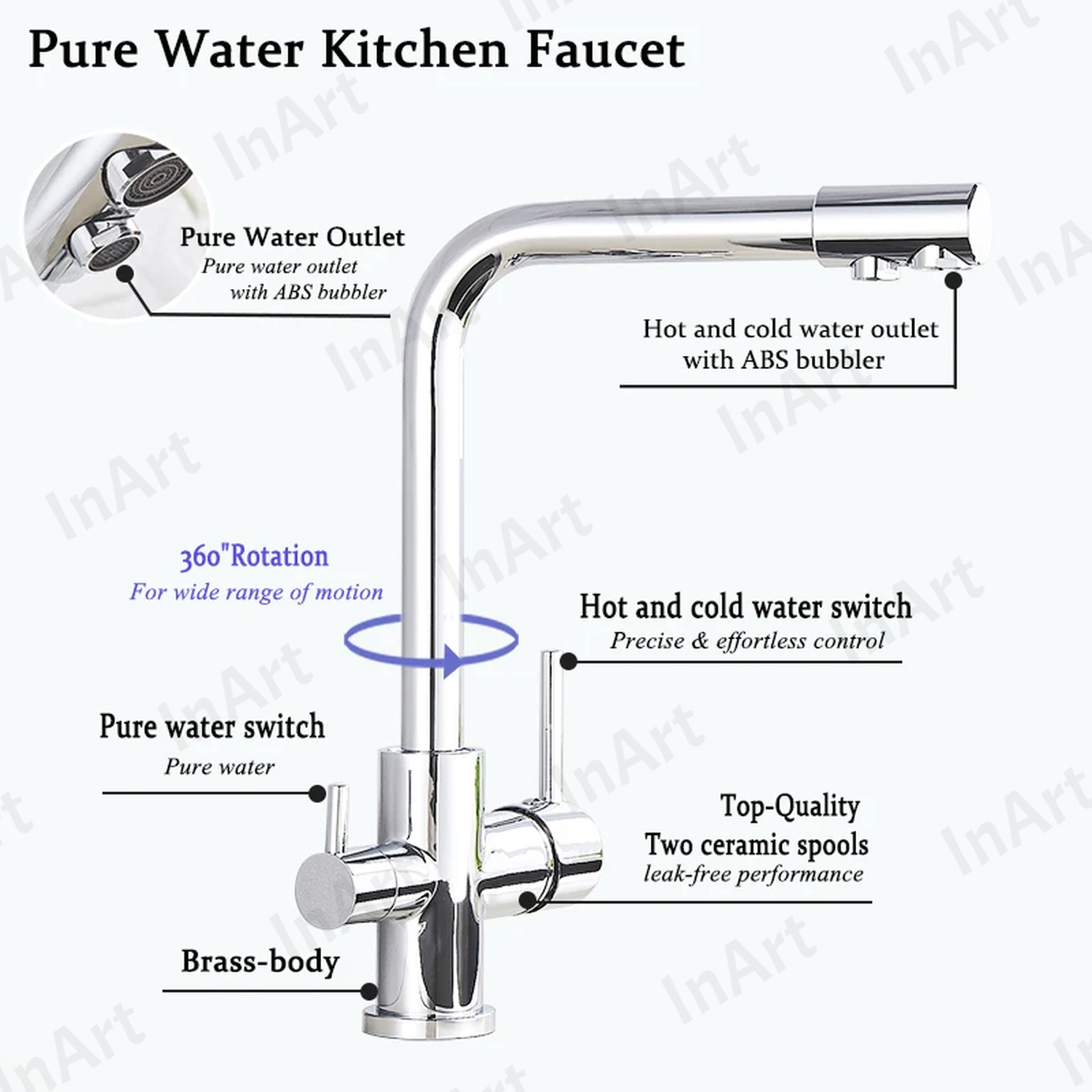 | Special Feature | 3-Way Water Filter and Normal Water Tap Kitchen Faucet Mixer, Dual handles for hot and cold water, 360-degree swivel spout |