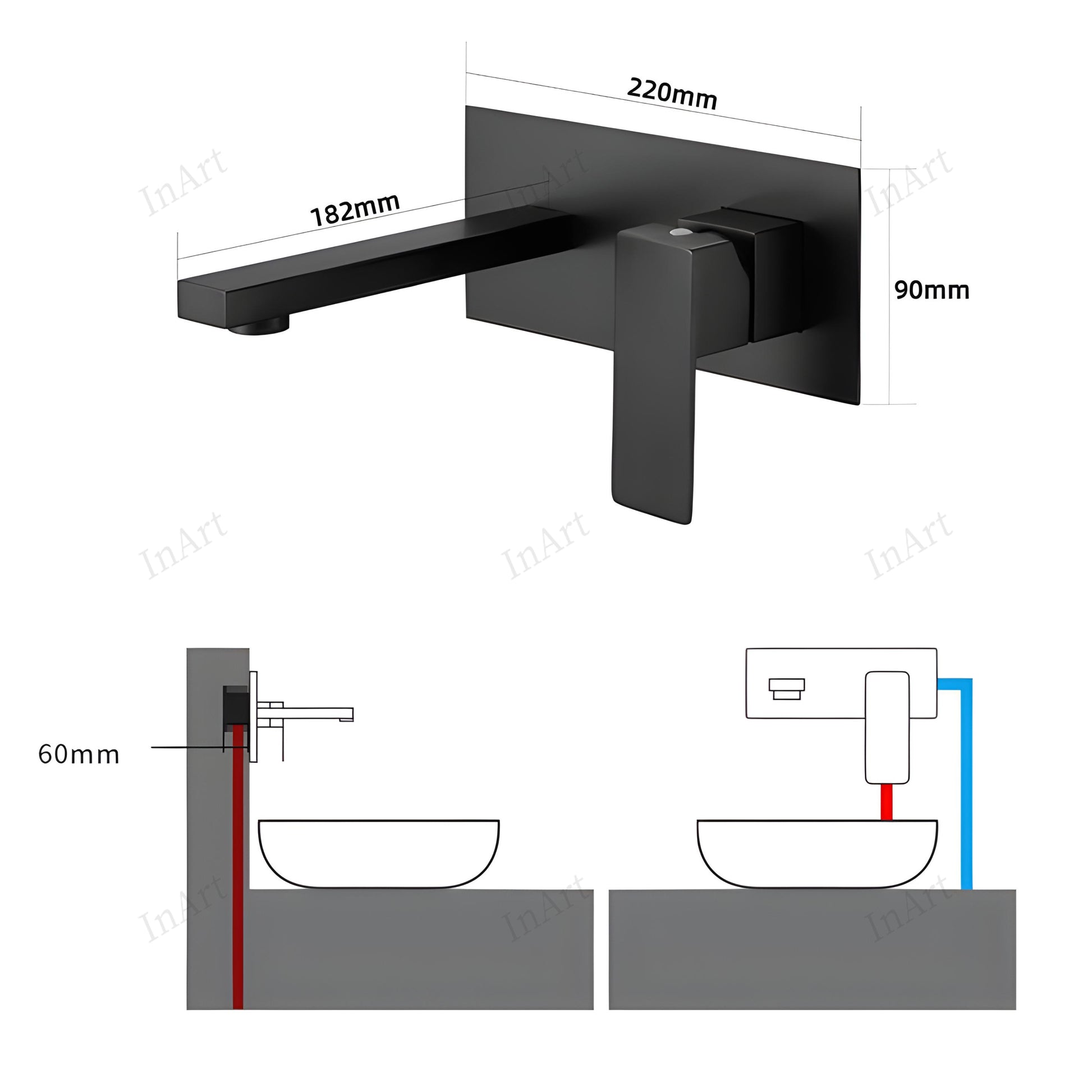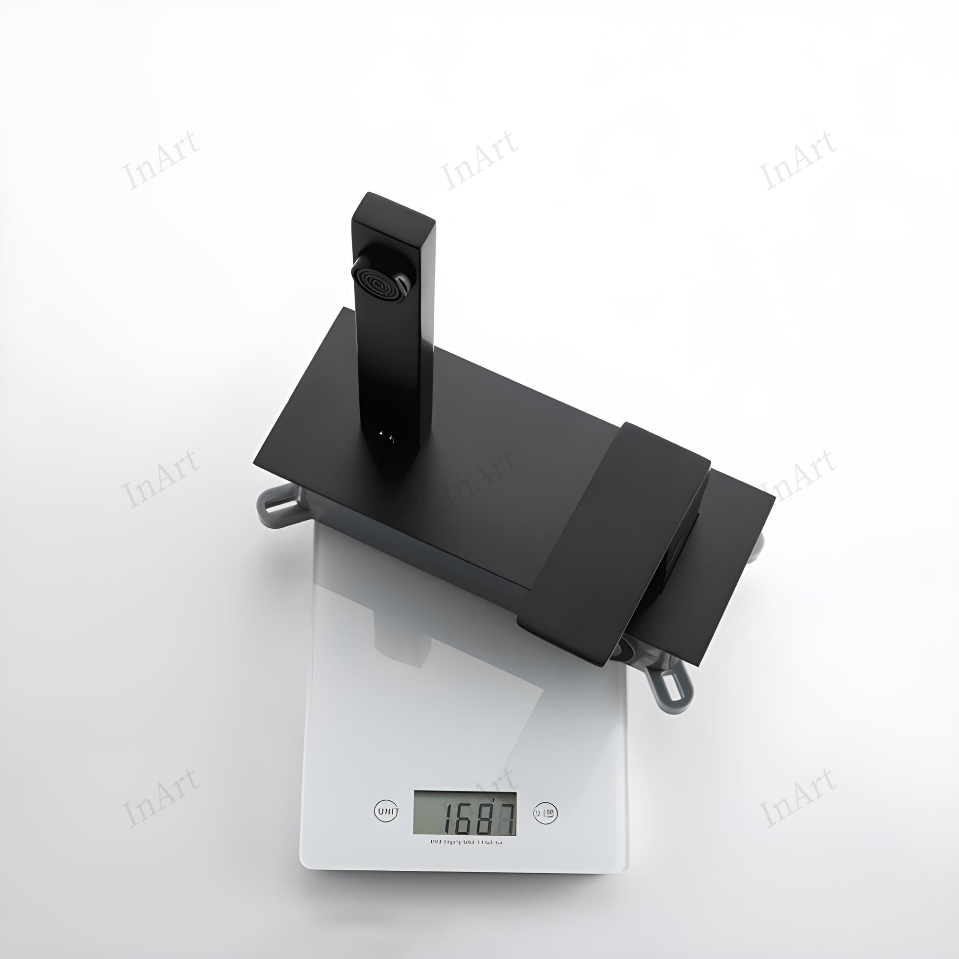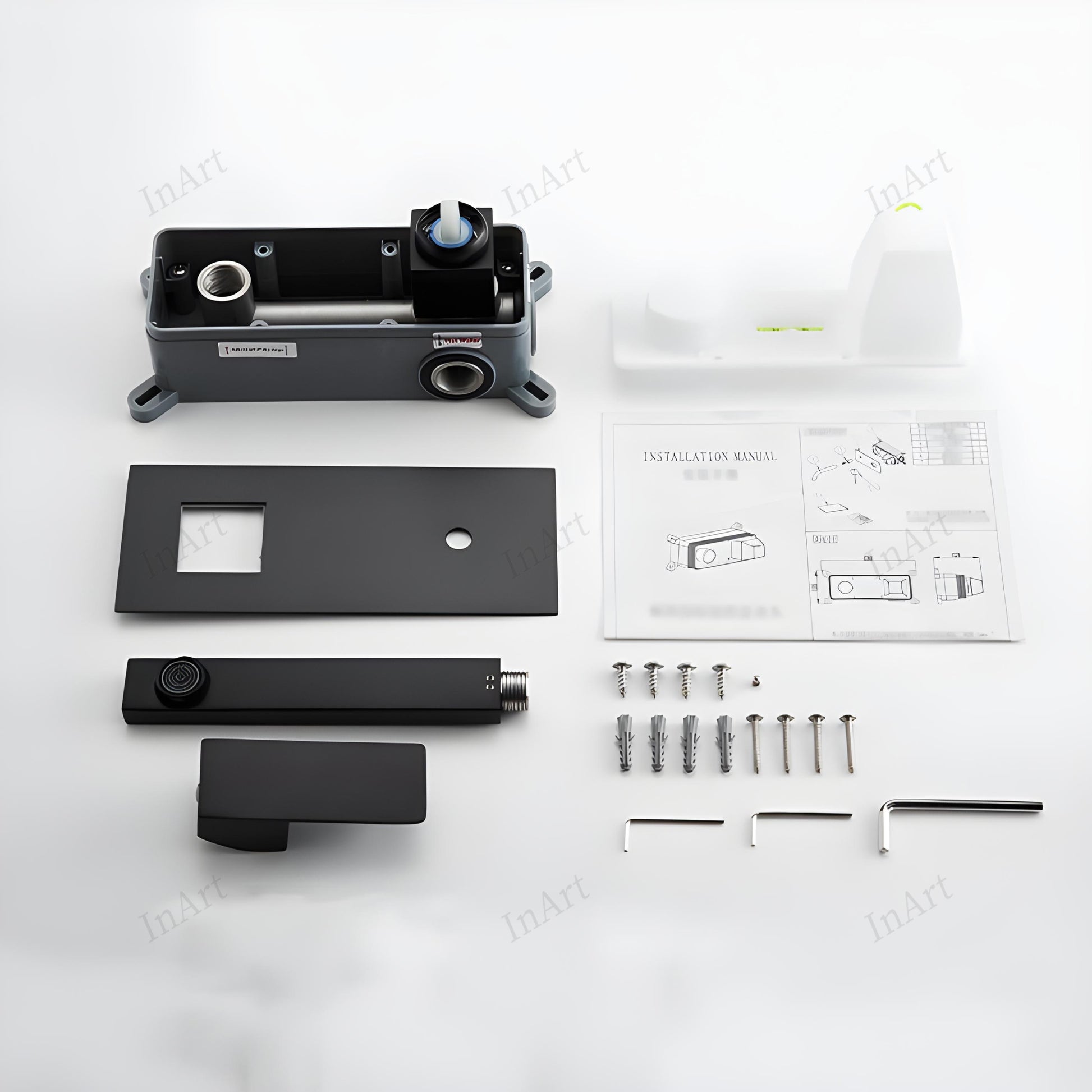 Installing the InArt Black Matt Wall Mount Single Lever Basin Mixer Tap is straightforward. The package includes all necessary installation hardware such as the diverter body, spout, exposed part plate, and handle. The faucet is designed for wall mounting, ensuring a clean and seamless look in your bathroom or living room.