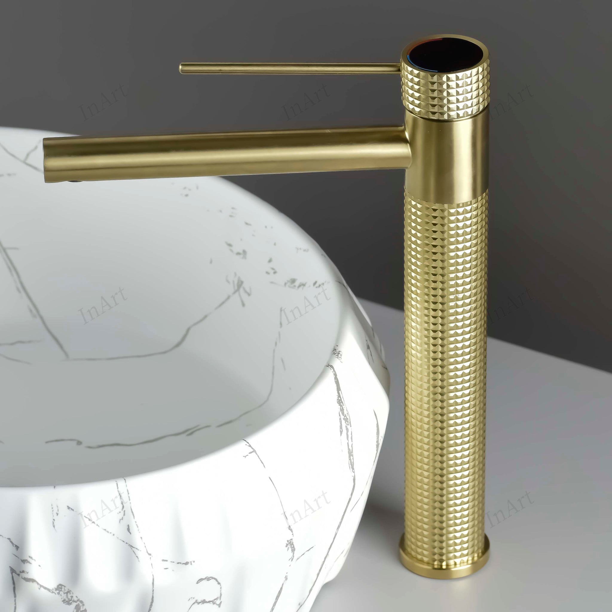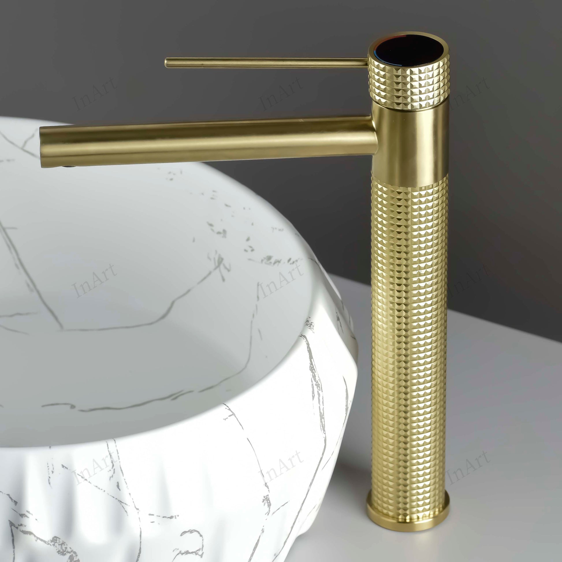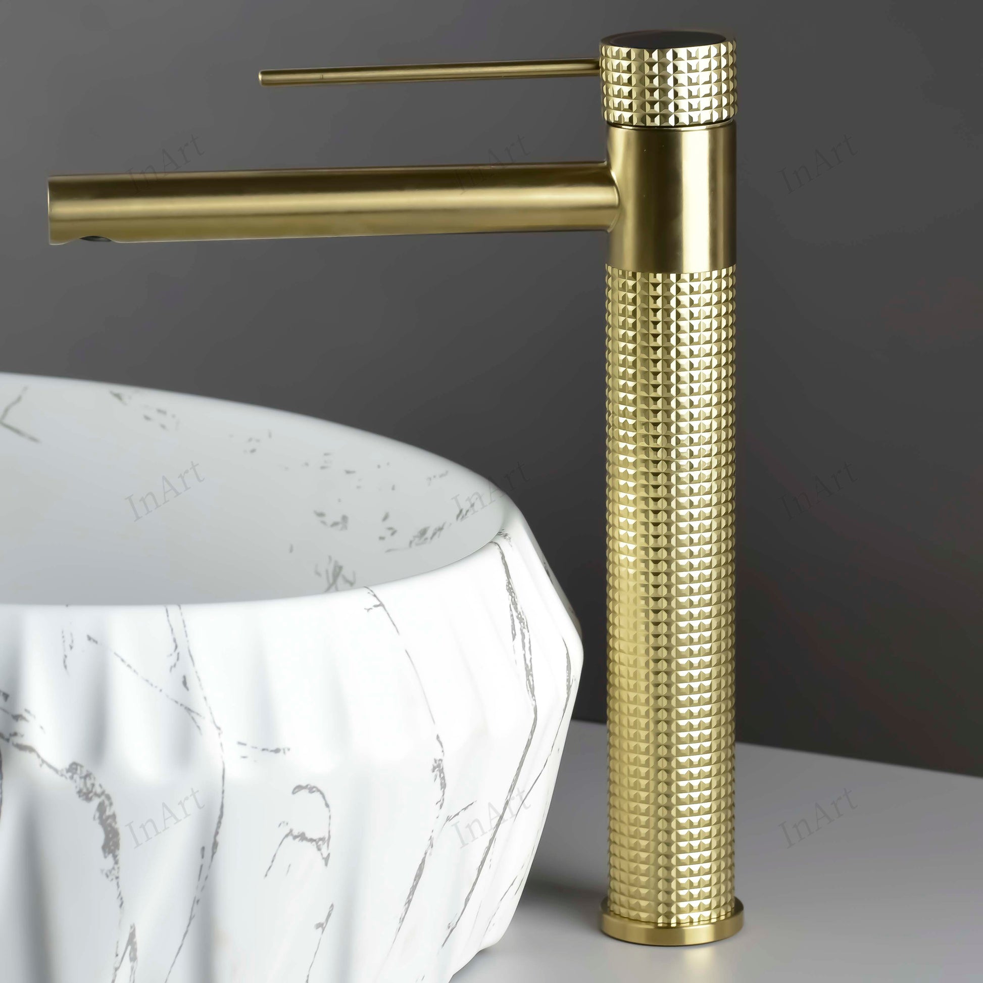 Enhance your bathroom or kitchen with the InArt Single Lever Basin Mixer Tap in a captivating brushed gold finish. This tap exudes elegance and luxury, offering a perfect balance of aesthetics and performance to elevate your space.