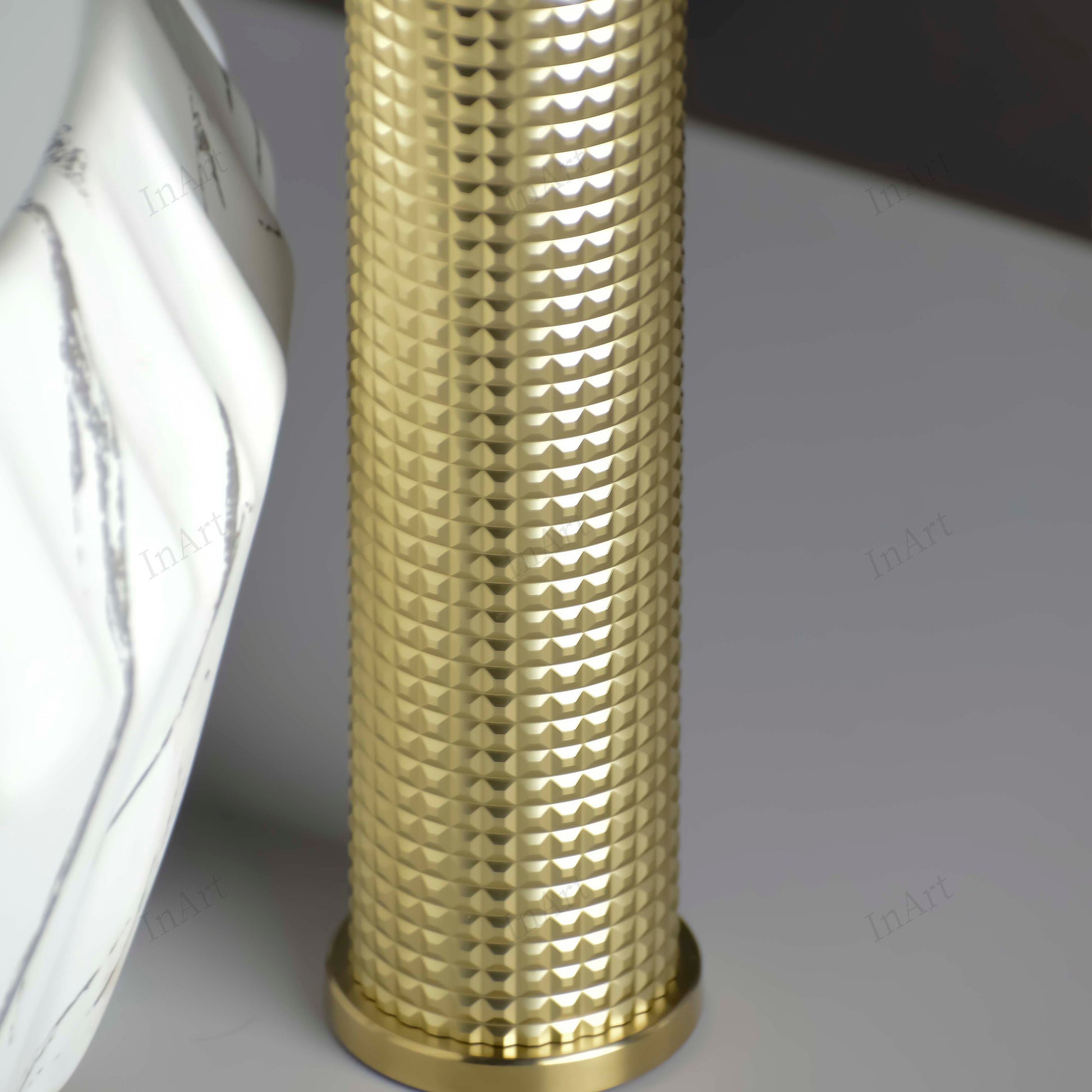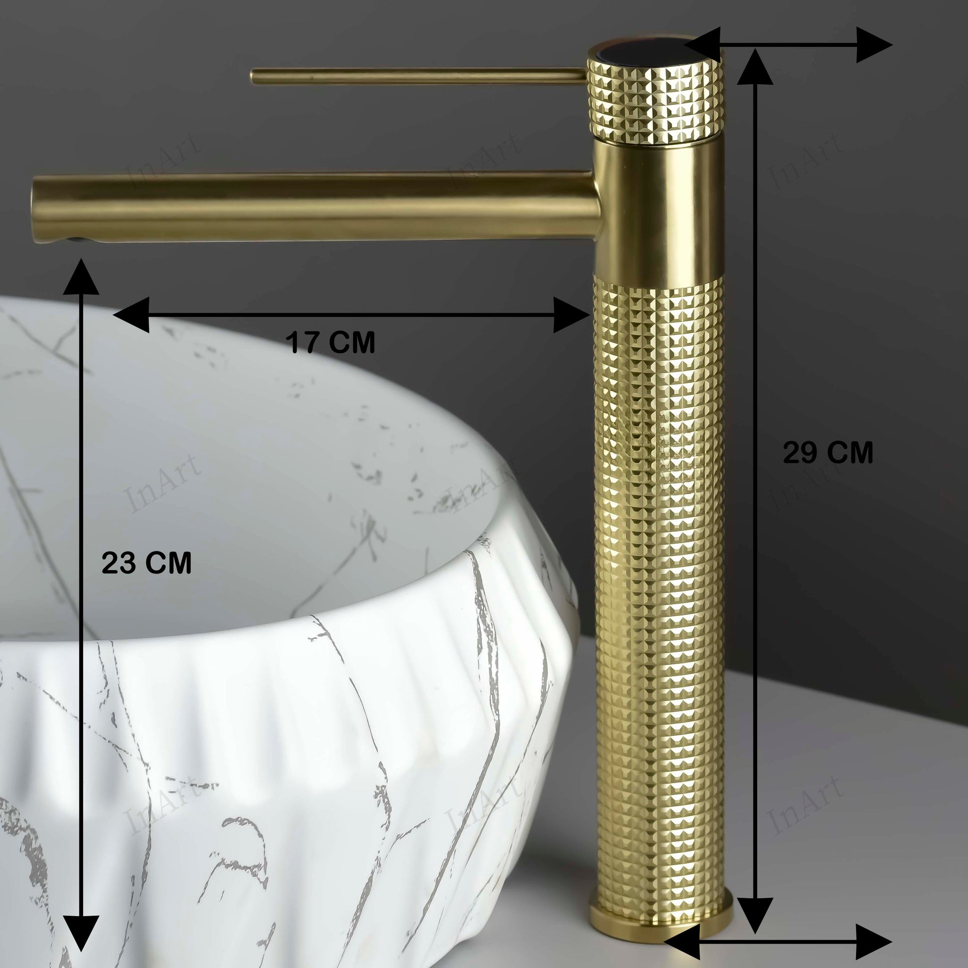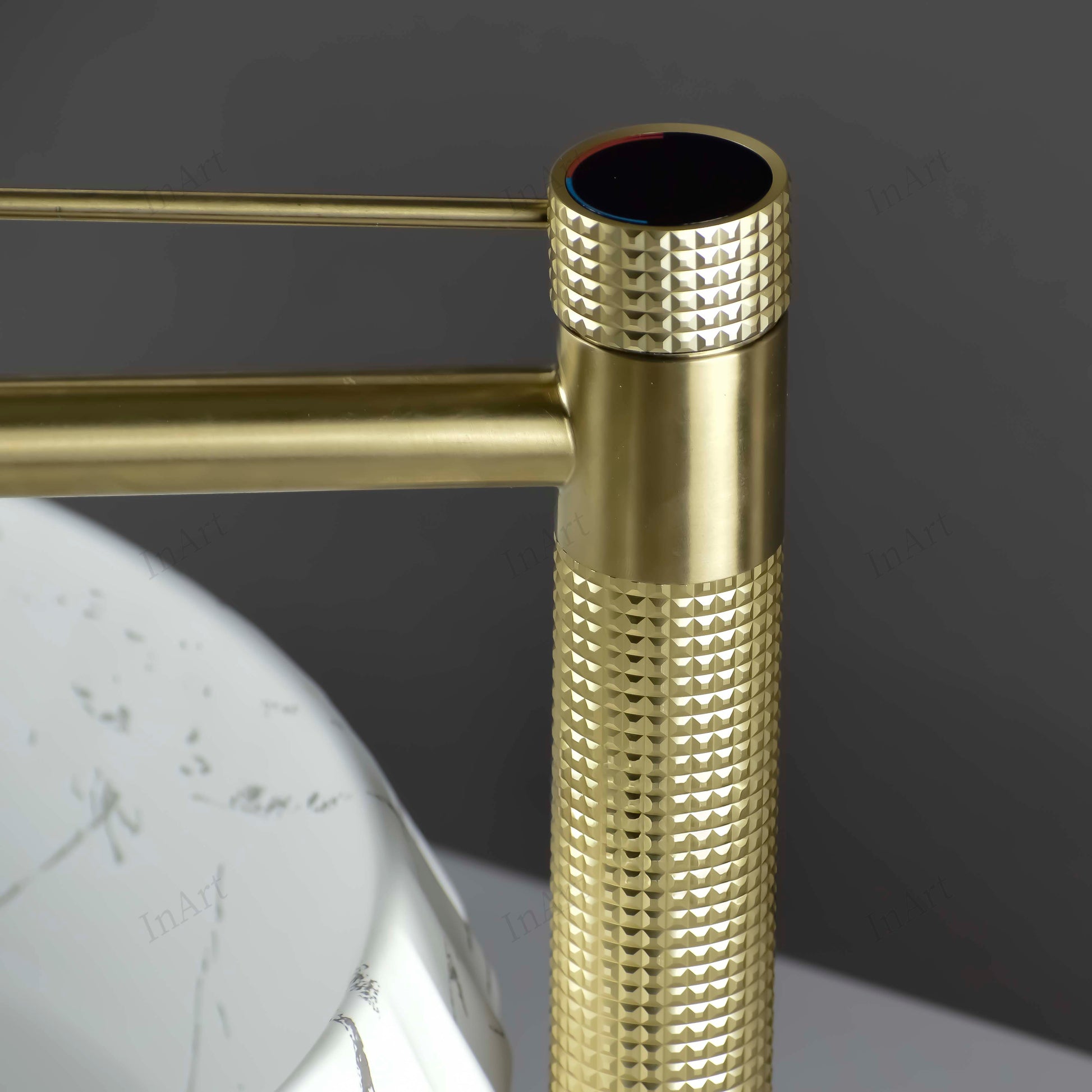 Enhance your bathroom or kitchen with the InArt Single Lever Basin Mixer Tap in a captivating brushed gold finish. This tap exudes elegance and luxury, offering a perfect balance of aesthetics and performance to elevate your space.