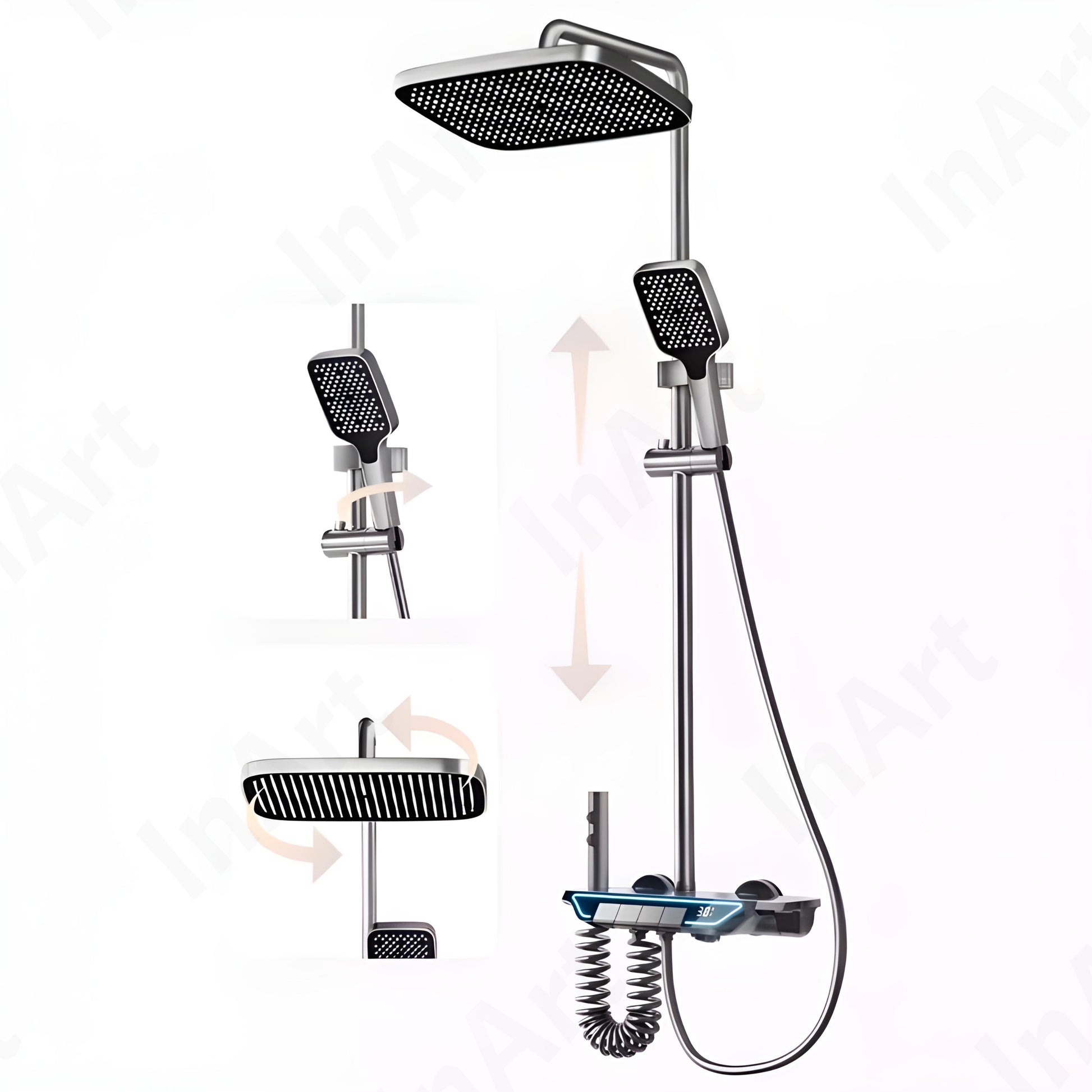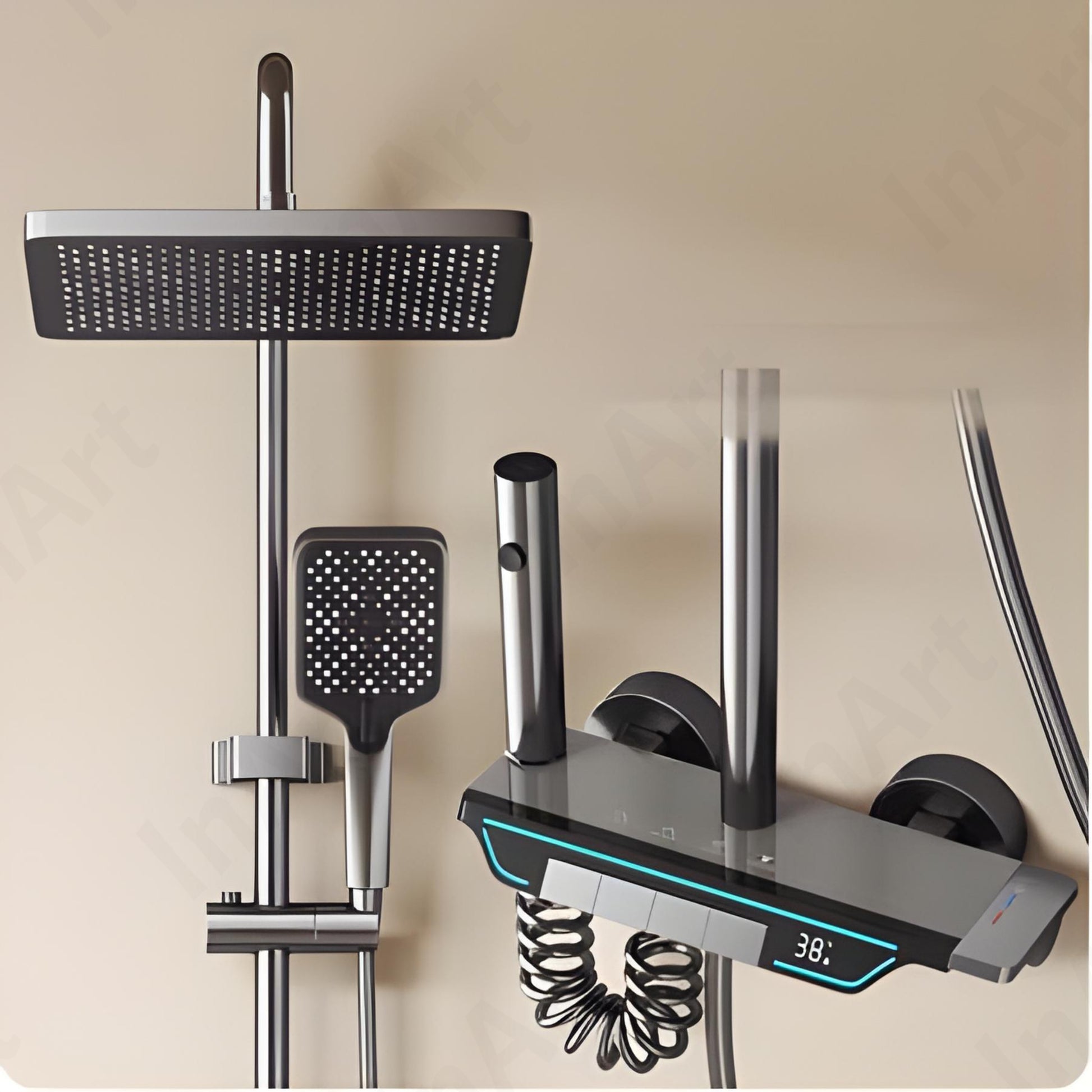 InArt Solid Brass Shower Panel Set, Digital Temperature Display, 4 Functions, Handheld Shower, Overhead Rainshower, Spout, Health Faucet, Black SP034